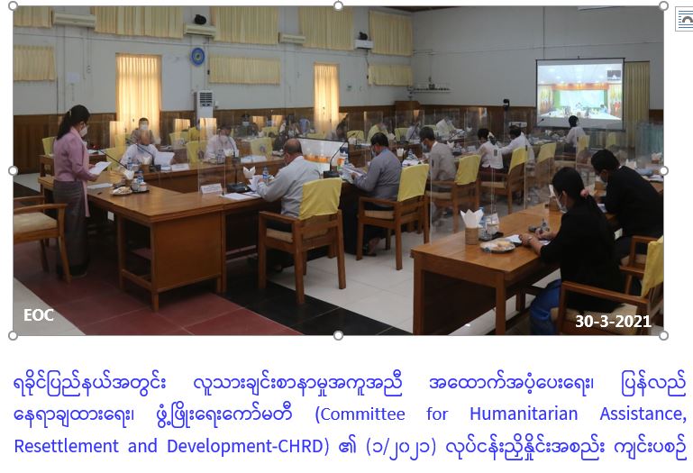 ရခိုင်ပြည်နယ်အတွင်း လူသားချင်းစာနာမှုအကူအညီ အထောက်အပံ့ပေးရေး၊ ပြန်လည် နေရာချထားရေး၊ ဖွံ့ဖြိုးရေးကော်မတီ (Committee for Humanitarian Assistance, Resettlement and Development-CHRD) ၏ (၁/၂၀၂၁) လုပ်ငန်းညှိနှိုင်းအစည်း အဝေးကို ယနေ့မွန်းလွဲပိုင်းတွင် နေပြည်တော်ရှိ လူမှုဝန်ထမ်း၊ ကယ်ဆယ်ရေးနှင့် ပြန်လည်နေရာချထား ရေးဝန်ကြီးဌာန အစည်းအဝေးခန်းမ၌ ကျင်းပပြုလုပ်ခဲ့ပါသည်။