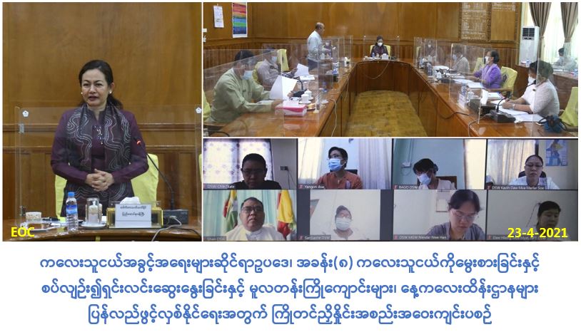ကလေးသူငယ်အခွင့်အရေးများဆိုင်ရာဥပဒေ၊ အခန်း(၈) ကလေးသူငယ်ကို မွေးစား ခြင်းနှင့်စပ်လျဉ်း၍ ရှင်းလင်းဆွေးနွေးခြင်းနှင့် မူလတန်းကြိုကျောင်းများ၊ နေ့ကလေးထိန်း ဌာနများ ပြန်လည်ဖွင့်လှစ်နိုင်ရေးအတွက် ကြိုတင်ညှိနှိုင်းဆွေးနွေးခြင်းကို (၂၃.၄.၂၀၂၁) ရက်နေ့၊ နံနက်(၁၀:၀၀)နာရီတွင် လူမှုဝန်ထမ်း၊ ကယ်ဆယ်ရေးနှင့် ပြန်လည်နေရာချထား ရေးဝန်ကြီးဌာန၊ ဝန်ကြီးဌာနအစည်းအဝေးခန်းမ၌ ကျင်းပခဲ့ပါသည်။ အဆိုပါအခမ်းအနားသို့ လူမှုဝန်ထမ်း၊ ကယ်ဆယ်ရေးနှင့် ပြန်လည်နေရာချထားရေးဝန်ကြီးဌာန၊ ပြည်ထောင်စု ဝန်ကြီး၊ ဒေါက်တာသက်သက်ခိုင်၊ ဒုတိယဝန်ကြီး၊ ဦးအောင်ထွန်းခိုင်၊ အမြဲတမ်းအတွင်းဝန်၊ ညွှန်ကြားရေးမှူးချုပ်များ၊ ဒုတိယညွှန်ကြားရေးမှူးချုပ်များ၊ ညွှန်ကြားရေးမှူးများနှင့် တာဝန် ရှိသူများ၊ လူမှုဝန်ထမ်းဦးစီးဌာန၊ နေပြည်တော်ကောင်စီ၊ တိုင်းဒေသကြီး၊ ပြည်နယ်ဦးစီးမှူး များ တက်ရောက်ခဲ့ပါသည်။