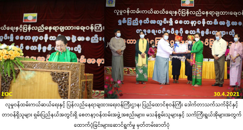 ရှမ်းပြည်နယ်အတွင်းရှိ စေတနာ့ဝန်ထမ်းအဖွဲ့အစည်းများ၊ မသန်စွမ်းသူများ နှင့်သက်ကြီးရွယ်အိုများအတွက် ထောက်ပံ့ခြင်းအခမ်းအနားကို ၃၀-၄-၂၀၂၁ ရက်နေ့ နံနက်ပိုင်းတွင် တောင်ကြီးမြို့၊ မြို့တော်ခန်းမ၌ ကျင်းပပြုလုပ်ခဲ့ရာ လူမှုဝန်ထမ်းကယ်ဆယ်ရေးနှင့် ပြန်လည်နေရာချထားရေး ဝန်ကြီးဌာန၊ ပြည်ထောင်စုဝန်ကြီး ဒေါက်တာသက်သက်ခိုင်၊ ရှမ်းပြည်နယ်စီမံအုပ်ချုပ်ရေး ကောင်စီဥက္ကဋ္ဌ၊ ဒေါက်တာကျော်ထွန်း၊ လူမှုဝန်ထမ်းကယ်ဆယ်ရေးနှင့် ပြန်လည် နေရာချထားရေးဝန်ကြီးဌာန၊ ဒုတိယဝန်ကြီး၊ ဦးအောင်ထွန်းခိုင်၊ အရှေ့ပိုင်းတိုင်းစစ်ဌာနချုပ် ဒုတိယတိုင်းမှူး ရှမ်းပြည်နယ်တရားသူကြီးချုပ်၊ ဦးကြွယ်ကြွယ်၊ ပြည်နယ်စီမံအုပ်ချုပ်ရေး ကောင်စီဝင်များ၊ ညွှန်ကြားရေးမှူးချုပ်များ၊ ဌာနဆိုင်ရာအကြီးအကဲများ မြို့မိမြို့ဖများ၊ လူမှုရေးအဖွဲ့အစည်းများနှင့် ဒေသခံပြည်သူများ တက်ရောက်ခဲ့ ပါသည်။