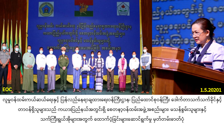 ကယားပြည်နယ်အတွင်းရှိ စေတနာ့ဝန်ထမ်းအဖွဲ့အစည်းများ၊ မသန်စွမ်းသူများ နှင့်သက်ကြီးရွယ်အိုများအတွက် ထောက်ပံ့ခြင်းအခမ်းအနားကို ၁-၅-၂၀၂၁ ရက်နေ့ နံနက်ပိုင်းတွင် လွိုင်ကော်မြို့ရှိ ကယားပြည်နယ်ခန်းမ၌ ကျင်းပပြုလုပ်ခဲ့ရာ လူမှုဝန်ထမ်းကယ်ဆယ်ရေးနှင့် ပြန်လည်နေရာချထားရေး ဝန်ကြီးဌာန၊ ပြည်ထောင်စုဝန်ကြီး ဒေါက်တာသက်သက်ခိုင်၊ ကယားပြည်နယ် စီမံအုပ်ချုပ်ရေး ကောင်စီဥက္ကဋ္ဌ၊ ဦးခင်မောင်ဦး၊ လူမှုဝန်ထမ်းကယ်ဆယ်ရေးနှင့် ပြန်လည် နေရာချထားရေးဝန်ကြီးဌာန၊ ဒုတိယဝန်ကြီး၊ ဦးအောင်ထွန်းခိုင်၊ ဒေသကွပ်ကဲမှုစစ်ဌာနချုပ်(လွိုင်ကော်)မှ ဒေသကွပ်ကဲရေးမှူး ဗိုလ်မှူးချုပ် ထွန်းနိုင်ဉီး၊ ပြည်နယ်စီမံအုပ်ချုပ်ရေး ကောင်စီဝင်များ၊ ညွှန်ကြားရေးမှူးချုပ်များ၊ ဌာနဆိုင်ရာ အကြီးအကဲများ မြို့မိမြို့ဖများ၊ စေတနာ့ဝန်ထမ်းအဖွဲ့အစည်းများမှကိုယ်စားလှယ်များနှင့် မသန်စွမ်းပုဂ္ဂိုလ်များ တက်ရောက်ခဲ့ပါသည်။