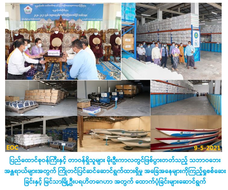 လူမှုဝန်ထမ်းကယ်ဆယ်ရေးနှင့် ပြန်လည်နေရာချထားရေးဝန်ကြီးဌာန၊ ပြည်ထောင်စုဝန်ကြီး ဒေါက်တာသက်သက်ခိုင်သည် ဒုတိယဝန်ကြီး၊ ဦးအောင်ထွန်းခိုင်နှင့်အတူ တာဝန်ရှိသူများလိုက်ပါလျက် ၉-၅-၂၀၂၁ ရက်နေ့ နံနက်ပိုင်းတွင် ရန်ကုန်တိုင်းဒေသကြီး၊ တောင်ဥက္ကလာပမြို့နယ်ရှိ မြင်သာမြို့ဦး ပရဟိတဂေဟာသို့ရောက်ရှိပြီး အဆိုပါကျောင်းတိုက်ရှိ ဆရာတော် ဦးပညာစာရ ထံသို့ လှူဖွယ်ပစ္စည်းများဆက်ကပ်လှူဒါန်းခြင်း၊ အဆိုပါပရဟိတဂေဟာတွင် လက်ခံစောင့်ရှောက်ထားသော ကလေး (၃၇၁)ဦးအား ၂၀၂၀-၂၀၂၁ ဘဏ္ဍာရေးနှစ် အတွက် ဝန်ကြီးဌာန၏ ဆန်ဖိုး၊ စားစရိတ်၊ ဝတ်စရိတ်နှင့် ဂေဟာမှူးလစာ ထောက်ပံ့ငွေစုစုပေါင်း ကျပ်(၅၄၈.၉၇)သိန်းကို ဆရာတော်ထံထောက်ပံ့လှူဒါန်းခြင်း နှင့်ပရဟိတဂေဟာအတွင်း ကလေးများ စာပေ၊ ဂီတ၊ ရသ၊ ကွန်ပျူတာ သင်ကြား နိုင်ရေးပြင်ဆင်ဆောင်ရွက်ထားရှိမှု အခြေအနေများကို လှည့်လည်ကြည့်ရှု စစ်ဆေးရာ တာဝန်ရှိသူများက လိုက်လံရှင်းလင်းပြသခဲ့ကြပါသည်။ ဆက်လက်၍ မွန်းလွဲပိုင်းတွင် ပြည်ထောင်စုဝန်ကြီးနှင့် တာဝန်ရှိသူများသည် မရမ်းကုန်းမြို့နယ်၊ ကျိုက်ဝိုင်းဘုရားလမ်းရှိ ဘေးအန္တရာယ်ဆိုင်ရာစီမံခန့်ခွဲမှုဦးစီးဌာန၊ ဗဟိုသိုလှောင် ရုံ(ရန်ကုန်)သို့ရောက်ရှိခဲ့ပြီး မိုးကြိုကာလနှင့် မိုးဦးကာလတွင် ဖြစ်ပွားတတ်သော သဘာဝဘေးအန္တရာယ်များအတွက် ကြိုတင်ပြင်ဆင်ဆောင်ရွက်ထားရှိမှု အနေဖြင့် ကယ်ဆယ်ရေးပစ္စည်းများ သိုလှောင်ထားရှိမှုနှင့် ဖြန့်ခွဲထောက်ပံ့နိုင်ရေး စီစဉ် ဆောင်ရွက်ထားရှိမှုအခြေအနေများကို ကြည့်ရှုစစ်ဆေးရာ တိုင်းဒေသကြီး ဦးစီးမှူးနှင့် သိုလှောင်ရုံတာဝန်ခံက ဗဟိုသိုလှောင်ရုံ (ရန်ကုန်မြို့)တွင် ကယ်ဆယ်ထောက်ပံ့ရေးပစ္စည်း (၁၇)မျိုး၊ အိမ်ထောင်စု (၁၅၀၀၀)စာ၊ ဒေသဖွံ့ဖြိုး ရေးသုံးပစ္စည်းများနှင့် အလှူပစ္စည်းများ၊ ရန်ကုန်တိုင်း ဒေသကြီးဦးစီးမှူးရုံး သိုလှောင်ရုံတွင် ကယ်ဆယ်ရေးပစ္စည်း အိမ်ထောင်စု (၅၀၀၀)စုစာ သိုလှောင် ထားရှိပါကြောင်း၊ ဗဟိုသိုလှောင်ရုံ(ရန်ကုန်မြို့)မှ အောက်မြန်မာပြည်ရှိ ကရင် ပြည်နယ်၊ မွန်ပြည်နယ်၊ ရခိုင်ပြည်နယ်၊ တနင်္သာရီတိုင်းဒေသကြီး၊ ပဲခူးတိုင်း ဒေသကြီး၊ ရန်ကုန်တိုင်းဒေသကြီးနှင့် ဧရာဝတီတိုင်းဒေသကြီးတို့အတွင်း တိုင်းဒေသကြီး/ ပြည်နယ်/ခရိုင်/မြို့နယ် သိုလှောင်ရုံ စုစုပေါင်း (၅၀)ခုသို့ ကယ်ဆယ်ထောက်ပံ့ရေးပစ္စည်းကို အဓိကပေးပို့ဖြည့်တင်းလျက်ရှိပြီး ကျန်တိုင်း ဒေသကြီး/ပြည်နယ်/ခရိုင်/မြို့နယ်သိုလှောင်ရုံများသို့လည်း အရေးပေါ်အခြေ အနေနှင့်လိုအပ်ချက်ရှိမှုအပေါ်မူတည်၍ ပေးပို့ဖြည့်တင်းလျက်ရှိပါကြောင်း ရှင်းလင်းတင်ပြခဲ့ရာ ပြည်ထောင်စုဝန်ကြီးက ဗဟိုသိုလှောင်ရုံ(ရန်ကုန်)သည် အောက်မြန်မာပြည်အတ