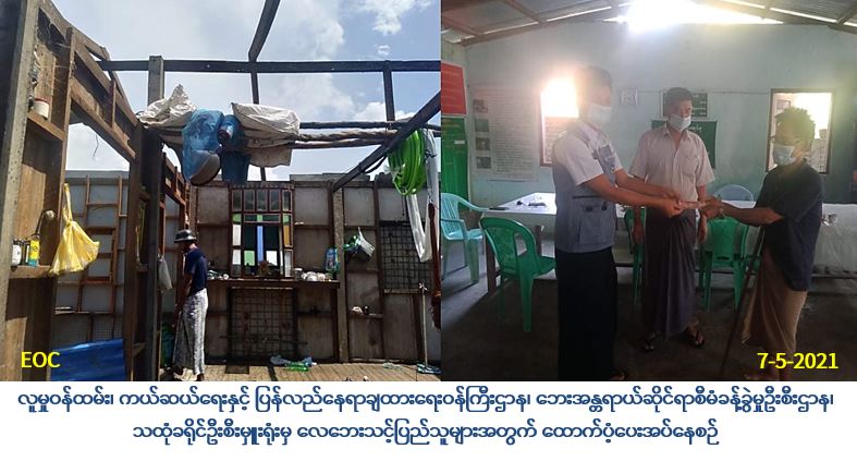 လူမှုဝန်ထမ်း၊ ကယ်ဆယ်ရေးနှင့် ပြန်လည်နေရာချထားရေးဝန်ကြီးဌာန၊ ဘေးအန္တရာယ်ဆိုင်ရာစီမံခန့်ခွဲမှုဦးစီးဌာန၊ သထုံခရိုင်ဦးစီးမှူးရုံးမှ တာဝန်ရှိသူများသည် (၆-၅-၂၀၂၁) ရက်နေ့(၁၃:၀၀)နာရီ အချိန်ခန့်တွင်မွန်ပြည်နယ် သထုံခရိုင်၊ ပေါင်မြို့နယ် ဖြူဘကျေးရွာအုပ်စု အကွက်(၅)နယ်မြေတွင် လေပြင်းတိုက်ခတ် မှုကြောင့် အမိုးလန်ခဲ့သည့်လူနေအိမ်(၁)လုံးအတွက် အိမ်ဆောက် ပစ္စည်းဖိုးထောက်ပံ့ငွေ (၉၀,၀၀ဝ) ကျပ် နှင့်လူဦးရေ စုစုပေါင်း(၄)ဦးတို့အတွက် (၇) ရက်စာဆန် ရိက္ခာဖိုးထောက်ပံ့ငွေ (၈,၄၀ဝ) ကျပ်၊ စုစုပေါင်းထောက် ပံ့ငွေ (၉၈,၄၀ဝ)ကျပ်အား (၇-၅-၂၀၂၁) ရက်နေ့ (၁၆:၀၀) နာရီအချိန်ခန့်တွင် ဖြူဘကျေးရွာအုပ်ချုပ်ရေးမှူးရုံး၌ဘေးသင့် ပြည်သူများထံလက်ဝယ်အရောက် သွားရောက် ထောက်ပံ့ပေးအပ်ခဲ့ပါကြောင်း သတင်းရရှိပါသည်။