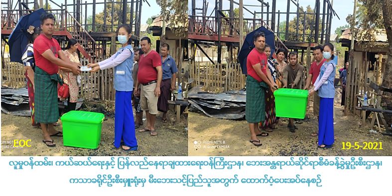 လူမှုဝန်ထမ်း၊ ကယ်ဆယ်ရေးနှင့် ပြန်လည်နေရာချထားရေးဝန်ကြီးဌာန၊ ဘေးအန္တရာယ်ဆိုင်ရာစီမံခန့်ခွဲမှုဦးစီးဌာန၊ ကသာခရိုင်ဦးစီးမှူးရုံးမှ (၁၆-၅-၂၀၂၁) နေ့၌ ကသာမြို့နယ်၊ လျှပ်စစ်ကုန်းရပ်ကွက်တွင် ခြင်နိုင်ဆေးခွေထွန်းထားရာမှတဆင့် မီးစတင်လောင်ကျွမ်းခဲ့သော မီးဘေးသင့်အိမ်ထောင်စု (၁) စုအတွက် အိမ်ဆောက်ပစ္စည်းဖိုးထောက်ပံ့ငွေ (၂၀၀,၀၀ဝ) ကျပ်နှင့် ဆန်ရိက္ခာဖိုးထောက်ပံ့ငွေ (၂,၁၀ဝ) ကျပ်၊ မီးဘေးသင့်သေဆုံးသူ(၁)ဦးအတွက် ထောက်ပံ့ငွေ (၃၀၀,၀၀ဝ) ကျပ်၊ စုစုပေါင်းထောက်ပံ့ငွေ (၅၀၂,၁၀ဝ) ကျပ်နှင့် Family kits (၁)ပုံး၊ အဝတ် Mask (၂)ခုတို့အား ဘေးသင့်ပြည်သူထံသို့ (၁၉-၅-၂၀၂၀) နေ့ (၁၄:၀၀) နာရီအချိန်တွင် သက်ဆိုင်ရာရပ်ကွက်လူကြီးများဖြင့် သွားရောက်ထောက်ပံ့ခဲ့ပါကြောင်း သတင်းရရှိပါသည်။