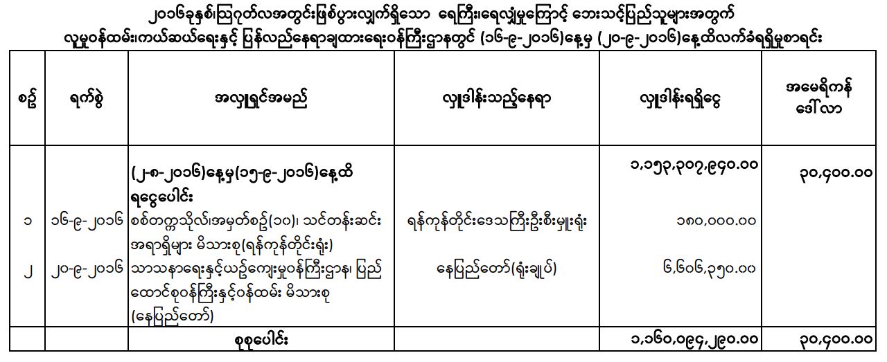 ၂၀၁၆ခုနှစ်၊ သြဂုတ်လအတွင်းဖြစ်ပွားလျှက်ရှိသော ရေကြီး၊ ရေလျှံမှုကြောင့် ဘေးသင့်ပြည်သူများအတွက် လူမှု၀န်ထမ်း၊ ကယ်ဆယ်ရေးနှင့် ပြန်လည်နေရာချထားရေး၀န်ကြီးဌာနတွင် (၁၆-၉-၂၀၁၆) ရက်နေ့မှ (၂၀-၉-၂၀၁၆) ရက်နေ့ထိ လက်ခံရရှိမှုစာရင်း