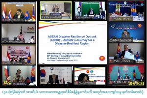 (၃၈) ကြိမ်မြောက် အာဆီယံ သဘာဝဘေးအန္တရာယ် စီမံခန့်ခွဲမှုကော်မတီအစည်းအဝေးနှင့် ဆက်စပ် အစည်းအဝေးများ၏ ဒုတိယနေ့အစည်းအဝေးကို (၉-၆-၂၀၂၁) ရက်နေ့၊ မြန်မာစံတော်ချိန် (၀၈:၃၀) နာရီအချိန်တွင် Video Conferencing ဖြင့် ကျင်းပပြုလုပ်ရာ အာဆီယံအဖွဲ့ဝင်နိုင်ငံများမှ ဘေးအန္တရာယ်ဆိုင်ရာ စီမံခန့်ခွဲမှုနှင့် သက်ဆိုင်သည့်ဌာနများမှ ကိုယ်စားလှယ်များ၊ အာဆီယံအတွင်းရေးမှူးချုပ်ရုံးနှင့် AHA Centre မှ တာဝန်ရှိသူများနှင့် လူမှုဝန်ထမ်း၊ ကယ်ဆယ်ရေးနှင့် ပြန်လည်နေရာချ ထားရေးဝန်ကြီးဌာန၊ အမြဲတမ်းအတွင်းဝန်/ ဘေးအန္တရာယ်ဆိုင်ရာစီမံခန့်ခွဲမှုဦးစီးဌာန၊ ညွှန်ကြားရေးမှူးချုပ်၊ ဒေါက်တာကိုကိုနိုင်နှင့် တာဝန်ရှိသူများ တက်ရောက်ခဲ့ကြပါသည်။