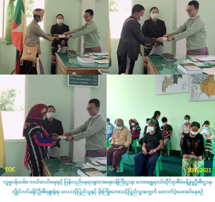 လူမှုဝန်ထမ်း၊ ကယ်ဆယ်ရေးနှင့် ပြန်လည်နေရာချထားရေးဝန်ကြီးဌာန၊ ဘေးအန္တရာယ်ဆိုင်ရာစီမံခန့်ခွဲမှုဦးစီးဌာန၊ လွိုင်လင်ခရိုင်ဦးစီးမှူးရုံးမှ တာဝန်ရှိသူများသည် (၅-၆-၂၀၂၁) ရက်နေ့တွင် နမ်စန်မြို့၌ မိုးသည်းထန်စွာရွာသွန်းပြီး လေပြင်းတိုက်ခတ်မှုကြောင့် နမ်စန်မြို့နယ်၊ နမ့်လစ်ကျေးရွာအုပ်စု၊ ပုတ်ပျံကျေးရွာ၌ ဘုန်းကြီးကျောင်း(၁)ကျောင်းနှင့် နေအိမ်(၁၁)လုံး အမိုးလန်ပျက်စီးခဲ့သည့်အတွက် ပျက်စီးဆုံးရှုံးမှုအလိုက် သတ်မှတ်ထောက်ပံ့နှုန်းထားအတိုင်း အိမ်ဆောက်ပစ္စည်းဖိုးစုစုပေါင်းငွေ (၁,၀၆၅,၆၀၀) ကျပ်နှင့် (၈-၆-၂၀၂၁) ရက်နေ့တွင်နမ်စန်မြို့၊ မက်မွန်းမုန်းကျေးရွာအုပ်စု၊ အမှတ်(၂)ကျေးရွာ၌ မိုးကြိုးထိမှန်၍ သေဆုံးသူ(၁)ဦးအတွက်ထောက်ပံ့ငွေ (၃၀၀,၀၀၀) ကျပ် တို့အား (၁၀-၅-၂၀၂၁) ရက်နေ့၊ မွန်းလွဲပိုင်း(၁၄:ဝ၀)အချိန်တွင် နမ်စန်မြို့နယ်စီမံအုပ်ချုပ်ရေးအဖွဲ့မှ တာဝန်ရှိသူများနှင့်အတူ ဘေးသင့်ပြည်သူများနှင့် သေဆုံးသူမိသားစုထံသို့ ထောက်ပံ့ပေးအပ်ခဲ့ပြီး သဘာဝဘေးအသိပညာပေးလက်ကမ်း စာစောင်များ ဖြန့်ဝေခဲ့ပါကြောင်း သတင်းရရှိပါသည်။