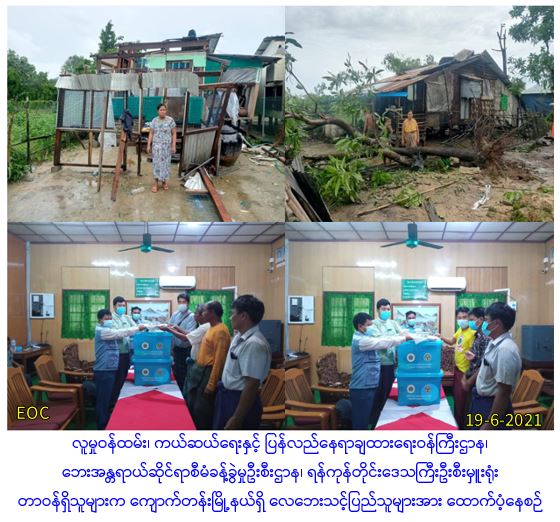 လူမှုဝန်ထမ်း၊ ကယ်ဆယ်ရေးနှင့် ပြန်လည်နေရာချထားရေးဝန်ကြီးဌာန၊ ဘေးအန္တရာယ်ဆိုင်ရာ စီမံခန့်ခွဲမှုဦးစီးဌာန၊ ရန်ကုန်တိုင်းဒေသကြီးဦးစီးမှူးရုံးမှ တာဝန်ရှိသူများသည် ရန်ကုန်တောင်ပိုင်းခရိုင်၊ ကျောက်တန်းမြို့နယ်၊ ရွှေပျောက်ကျေးရွာအုပ်စုနှင့် ရွေပြည်သာယာကျေးရွာအုပ်စုတို့တွင် (၁၆-၆-၂၀၂၁)ရက်နေ့၌ လေပြင်းတိုက်ခတ်မှုကြောင့် အိမ်ခြေ(၂၉) လုံးပြိုကျခဲ့ပြီး (၂၆)လုံး အမိုးလန်ပျက်စီးဆုံးရှုံးခဲ့ရာ အိမ်ထောင်စု(၅၅)စု လေဘေးသင့်ခဲ့ပါသဖြင့် အဆိုပါ လေဘေးသင့် အိမ်ခြေ(၅၅)လုံးအတွက် အိမ်ဆောက်ပစ္စည်းဖိုး ထောက်ပံ့ငွေ (၄၂၀၀၀၀ဝ/-)ကျပ်နှင့် ဆန်ရိက္ခာဖိုးထောက်ပံ့ငွေ(၃၄၂၃ဝဝိ/-) ကျပ်၊ စုစုပေါင်း (၄၅၄၂၃၀၀/-)ကျပ်အား (၁၈-၆-၂၀၂၁)ရက်နေ့ (၁၃း၃၀)အချိန်တွင် ကျောက်တန်းမြို့နယ်စီမံအုပ်ချုပ်ရေးအဖွဲ့မှ တာဝန်ရှိသူများနှင့်အတူ ဘေးသင့်ပြည်သူများ လက်ဝယ်အရောက်ထောက်ပံ့ပေးအပ်ခဲ့ပါကြောင်း သတင်းရရှိခဲ့ပါသည်။