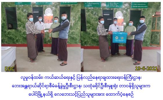 လူမှုဝန်ထမ်း၊ ကယ်ဆယ်ရေးနှင့် ပြန်လည်နေရာချထားရေးဝန်ကြီးဌာန၊ ဘေးအန္တရာယ်ဆိုင်ရာစီမံခန့်ခွဲမှုဦးစီးဌာန၊ သထုံခရိုင်ဦးစီးမှူးရုံးမှ တာဝန်ရှိသူများသည် (၁၇-၆-၂၀၂၁)ရက်နေ့ (၀၁:၀၀)နာရီ အချိန်ခန့်တွင်မွန်ပြည်နယ် သထုံခရိုင်၊ ပေါင်မြို့နယ် အလှပ်ကျေးရွာအုပ်စုတွင် မိုးသည်းထန်စွာရွာသွန်းပြီးလေပြင်းတိုက်ခတ်မှုကြောင့် ပြိုကျပျက်စီးခဲ့သည့် လူနေအိမ်(၁)လုံးအတွက် အိမ်ဆောက်ပစ္စည်းဖိုးထောက်ပံ့ငွေ (၁၀၀,၀၀ဝ/-)ကျပ်နှင့် ဘေးသင့်လူဦးရေ (၆)ဦး အတွက် (၇)ရက်စာဆန်ရိက္ခာဖိုးထောက်ပံ့ငွေ (၁၂,၆၀၀) ကျပ်၊ စုစုပေါင်းထောက်ပံ့ငွေ (၁၁၂,၆၀၀/-) ကျပ်နှင့် ပြိုကျပျက်စီးနေအိမ် (၁)လုံးအတွက် ကယ်ဆယ်ရေးပစ္စည်းတန်ဖိုးငွေ(၄၆၀၃၆/-)ကျပ်တို့အား (၁၈-၆-၂၀၂၁)ရက်နေ့ (၁၅:၃၀) နာရီအချိန်ခန့်တွင် ပေါင်မြို့နယ်အထွေထွေအုပ်ချုပ်ရေးဦးစီးဌာန၌ ဘေးသင့်ပြည်သူများလက်ဝယ်အရောက် ထောက်ပံခဲ့ပါကြောင်း သတင်းရရှိပါသည်။