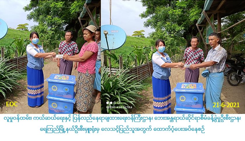 လူမှုဝန်ထမ်း၊ ကယ်ဆယ်ရေးနှင့် ပြန်လည်နေရာချထားရေးဝန်ကြီးဌာန၊ ဘေးအန္တရာယ်ဆိုင်ရာစီမံခန့်ခွဲမှုဦးစီးဌာန၊ ရေကြည်မြို့နယ်ဦးစီးမှူးရုံးမှ တာဝန်ရှိသူများသည် ရေကြည်မြို့နယ်၊ ကညင်ငူကျေးရွာအုပ်စု၊ ကညင်ငူကျေးရွာတွင် (၁၆-၆-၂၀၂၁) ရက်နေ့တွင် လေဘေးကြောင့် ပြိုကျပျက်စီးနေအိမ်(၂)လုံးအတွက် အိမ်ဆောက်ပစ္စည်းဖိုးရန်ပုံငွေ (၃၀၀,၀၀ဝ)ကျပ်၊ အိမ်ထောင်စု(၂)စုမှ စုစုပေါင်းလူဦးရေ(၄)ဦးအတွက် ဆန်ရိက္ခာ (၇) ရက်စာ ရန်ပုံငွေ (၈,၄၀၀)ကျပ်၊ စုစုပေါင်းကယ်ဆယ်ရေးရန်ပုံငွေ (၃၀၈,၄၀ဝ) ကျပ်နှင့်ကယ်ဆယ်ရေးပစ္စည်း(၁၇)မျိုးပါ (၂) အိမ်ထောင်စာ (၉၂,၀၇၂) ကျပ်အား (၂၁-၆-၂၀၂၁) ရက်နေ့ (၁၅:၄၀)နာရီအချိန် တာဝန်ရှိသူများရှေ့မှောက်၌ ဘေးသင့်ပြည်သူများ လက်ဝယ်အရောက် ထောက်ပံ့ပေးအပ်ခဲ့ပါကြောင်း သတင်းရရှိပါသည်။