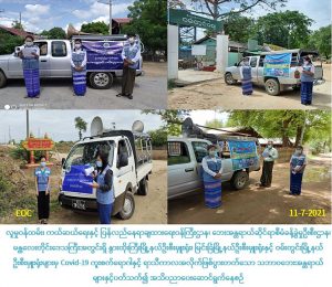 လူမှုဝန်ထမ်း၊ ကယ်ဆယ်ရေးနှင့် ပြန်လည်နေရာချထားရေးဝန်ကြီးဌာန၊ ဘေးအန္တရာယ်ဆိုင်ရာ စီမံခန့်ခွဲမှုဦးစီးဌာန၊ မန္တလေးတိုင်းဒေသကြီးအတွင်းရှိ နွားထိုးကြီးမြို့နယ်ဦးစီးမှူးရုံး၊ မြင်းခြံမြို့နယ်ဦးစီးမှူးရုံးနှင့် ဝမ်းတွင်းမြို့နယ်ဦးစီးမှူးရုံးတို့မှ တာဝန်ရှိသူများသည် နွားထိုးကြီးမြို့နယ်၊ မြင်းခြံမြို့နယ်နှင့် ဝန်းတွင်းမြို့နယ်အတွင်းရှိ ရပ်ကွက်၊ ကျေးရွာအုပ်စု၊ ကျေးရွာများသို့ (၁၁-၇-၂၀၂၁) ရက်နေ့တွင် COVID-19 ကူးဆက်ရောဂါ ကြိုတင်ကာကွယ်ရေးနှင့် ရာသီကာအလိုက်ဖြစ်ပွားတတ်သော သဘာဝဘေးအန္တရာယ်များအကြောင်း အသိပညာပေးခြင်း ဆောင်ရွက်ခဲ့ပါကြောင်း သတင်းရရှိပါသည်။