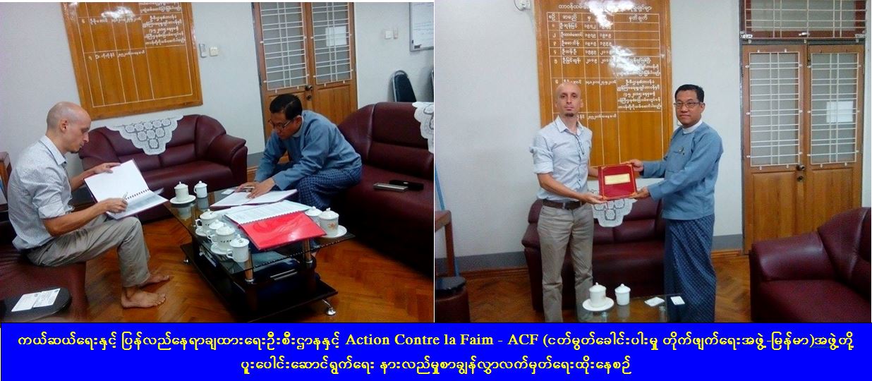 ကယ်ဆယ်ရေးနှင့် ပြန်လည်နေရာချထားရေးဦးစီးဌာနနှင့် Action Contre la Faim – ACF (ငတ်မွတ်ခေါင်းပါးမှု တိုက်ဖျက်ရေးအဖွဲ့-မြန်မာ)အဖွဲ့တို့ ပူးပေါင်းဆောင်ရွက်နိုင်ရန်အတွက် (၂၂.၉.၂၀၁၆)ရက်နေ့ (၁၃:ဝ၀)နာရီအချိန်တွင် ပူးပေါင်းဆောင်ရွက်ရေး နားလည်မှုစာချွန်လွှာအား ကယ်ဆယ်ရေးနှင့် ပြန်လည်နေရာချထားရေးဦးစီးဌာန ညွှန်ကြားရေးမှူးချုပ် ဒေါက်တာကိုကိုနိုင်နှင့် Mr. Juan Grabriel WELLS ၊ Country Director ၊ Action Contre la Faim – ACF (ငတ်မွတ်ခေါင်းပါးမှု တိုက်ဖျက်ရေးအဖွဲ့-မြန်မာ) တို့ လက်မှတ်ရေးထိုးခဲ့ကြကြောင်း သတင်းရရှိပါသည်။