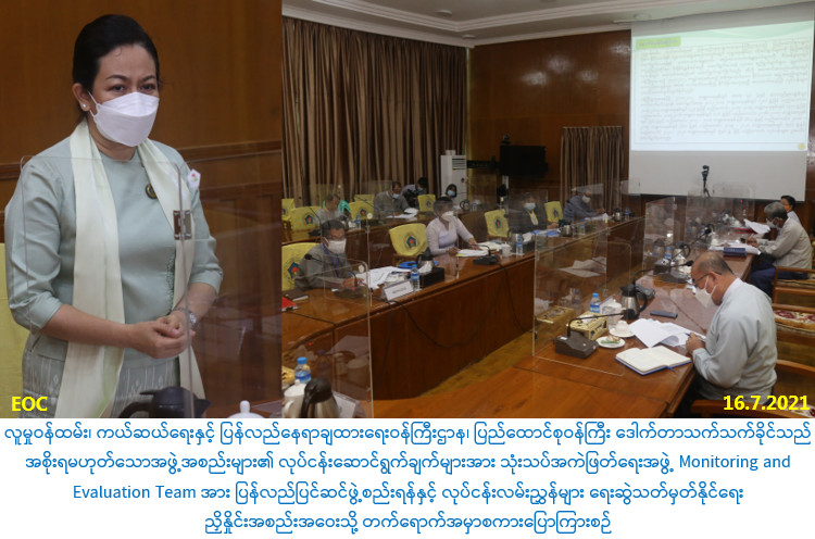 ထို့နောက် သက်ဆိုင်ရာ ဘာသာရပ်တာဝန်ရှိသူများမှ လူမှုဝန်ထမ်း၊ ကယ်ဆယ်ရေးနှင့် ပြန်လည်နေရာချထားရေးဝန်ကြီးဌာနနှင့် ပူးပေါင်းဆောင်ရွက်သည့် အစိုးရမဟုတ်သောအဖွဲ့ အစည်းများ၏ လုပ်ငန်းဆောင်ရွက်ချက်များအား သုံးသပ်အကဲဖြတ်ရေးအဖွဲ့ Monitoring and Evaluation Team အား ပြန်လည်ပြင်ဆင်ဖွဲ့စည်းရန်နှင့် လုပ်ငန်းလမ်းညွှန်များရေးဆွဲသတ်မှတ်နိုင်ရေး ညှိနှိုင်းဆွေးနွေးခဲ့ကြကြောင်း သတင်းရရှိပါသည်။