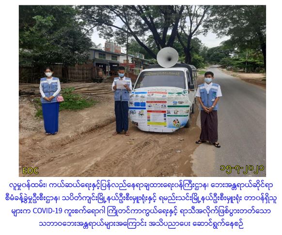 လူမှု၀န်ထမ်း၊ကယ်ဆယ်ရေးနှင့်ပြန်လည်နေရာချထားရေး၀န်ကြီးဌာန၊ ဘေးအန္တရာယ်ဆိုင်ရာ စီမံခန့်ခွဲမှုဦးစီးဌာန၊ မန္တလေးတိုင်းဒေသကြီးအတွင်းရှိ သပိတ်ကျင်းမြို့နယ်ဦးစီးမှူးရုံးနှင့် ရမည်းသင်းမြို့နယ်ဦးစီးမှူးရုံးတို့မှ တာ၀န်ရှိသူများသည် သပိတ်ကျင်းမြို့နယ်နှင့် ရမည်းသင်းမြို့နယ်ရှိ ရပ်ကွက်၊ ကျေးရွာများသို့ (၁၅-၇-၂၀၂၁) ရက်နေ့တွင် COVID-19 ကူးစက်ရောဂါ ကြိုတင်ကာကွယ်ရေးနှင့် ရာသီအလိုက်ဖြစ်ပွားတတ်သော သဘာဝဘေးအန္တရာယ်များအကြောင်း အသိပညာပေး ဆောင်ရွက်ခဲ့ပါကြောင်း သတင်းရရှိပါသည်။