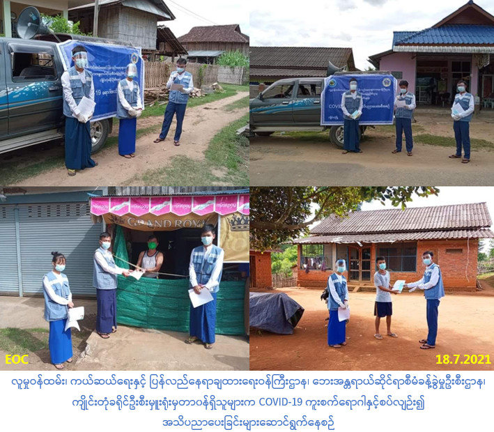 လူမှု၀န်ထမ်း၊ ကယ်ဆယ်ရေးနှင့် ပြန်လည်နေရာချထားရေး၀န်ကြီးဌာန၊ ဘေးအန္တရာယ်ဆိုင်ရာစီမံခန့်ခွဲမှုဦးစီးဌာန၊ ကျိုင်းတုံခရိုင်ဦးစီးမှူးရုံးမှတာဝန်ရှိသူများသည် (၁၈-၇-၂၀၂၁) ရက်နေ့၊ နံနက်ပိုင်းတွင် ကျိုင်းတုံမြို့နယ်၊ ကတ်ထိုက်ကျေးရွာအုပ်စု၊ ကတ်ထိုက်ကျေးရွာ၊ တင်ထပ် ကျေးရွာ၊ တုံကွမ်ကျေးရွာ၊ နောင်ရှန်ကျေးရွာ၊ ဟွေပုန်ကျေးရွာနှင့် ကတ်ဝုန်းကျေးရွာတို့၌ Covid-19 ကူးစက်ရောဂါ ပျံ့နှံ့မှုများ မဖြစ်ပွားစေရေးအတွက် ဆောင်ရန်/ ရှောင်ရန်အချက်များကို အသံချဲ့စက်ဖြင့် နှိုးဆော်ခြင်း၊ အသိပညာပေးလက်ကမ်းစာစောင်များ ဖြန့်ဝေခြင်းနှင့် Mask များဝေငှခြင်းတို့ကို ဆောင်ရွက်ခဲ့ပါကြောင်း သတင်းရရှိပါသည်။