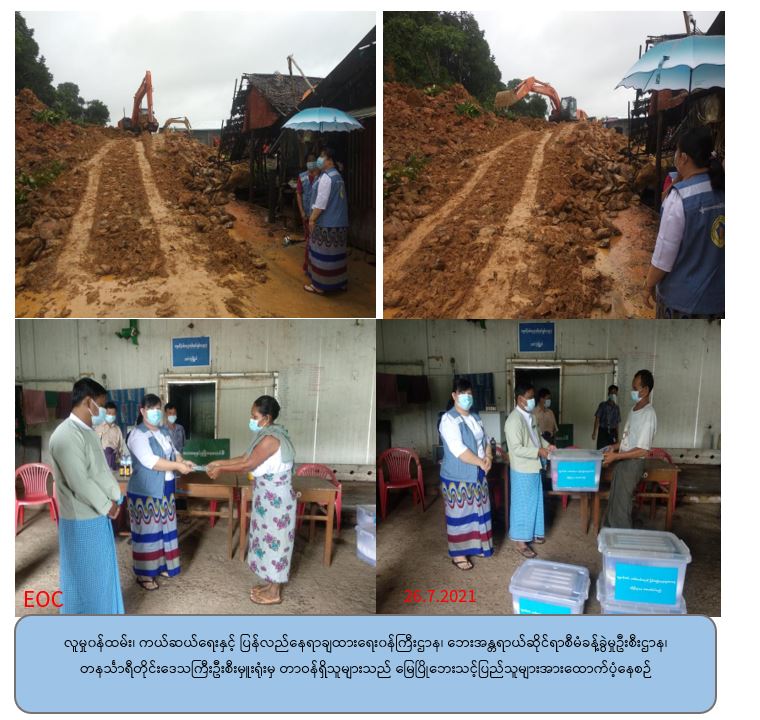 လူမှုဝန်ထမ်း၊ ကယ်ဆယ်ရေးနှင့် ပြန်လည်နေရာချထားရေးဝန်ကြီးဌာန၊ ဘေးအန္တရာယ်ဆိုင်ရာစီမံခန့်ခွဲမှုဦးစီးဌာန၊ တနင်္သာရီတိုင်ဒေသကြီးဦးစီးမှူးရုံးမှ တာဝန်ရှိသူများသည် (၂၅-၇-၂၀၂၁) ရက်နေ့တွင် ဖြစ်ပွားခဲ့သော လောင်းလုံးမြို့နယ်၊ ကျောက်နီမော်ကျေးရွာအုပ်စု၊ အင်းဂနီတွင်းကျေးရွတွင် မြေပြိုဘေးသင့်အိမ်ခြေ (၆)လုံးအတွက် အိမ်ဆောက်ပစ္စည်းဖိုးထောက်ပံ့ငွေ (၉၀၀,၀၀၀/-)ကျပ်၊ လူဦးရေ (၄၆)ဦး အတွက် (၇)ရက်စာဆန်ဖိုးထောက်ပံ့ငွေ (၉၆,၆၀၀/-) ကျပ်နှင့် ဒဏ်ရာရရှိသူ(၂)ဦးအတွက် ထောက်ပံ့ငွေ (၁၀၀,၀၀၀) စုစုပေါင်းထောက်ပံ့ငွေ (၁,၀၉၆,၆၀၀) ကျပ်နှင့် အိမ်ထောင်စု (၆)စုအတွက် ကယ်ဆယ်ရေးပစ္စည်း(၁၇)မျိုးပါ(၆)စု တို့အား (၂၆-၇-၂၀၂၁)ရက်နေ့၊ (၁၃:၃၀)အချိန်တွင် ဘေးသင့်ပြည်သူလက်ဝယ်အရောက် ထောက်ပံပေးအပ်ခဲ့ပါကြောင်း သတင်းရရှိပါသည်။