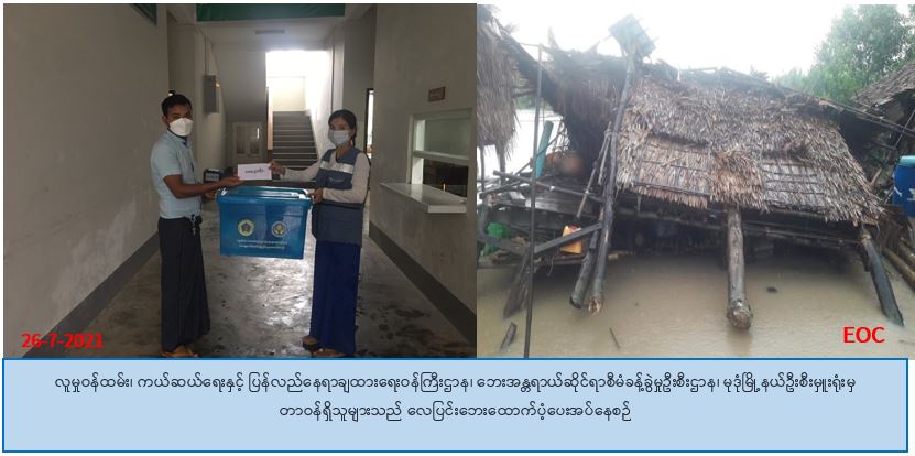 လူမှုဝန်ထမ်း၊ ကယ်ဆယ်ရေးနှင့်ပြန်လည်နေရာချထားရေးဝန်ကြီးဌာန၊ ဘေးအန္တရာယ်ဆိုင်ရာ စီမံခန့်ခွဲမှုဦးစီးဌာန၊ မွန်ပြည်နယ်၊ မော်လမြိုင်ခရိုင်၊ မုဒုံမြို့နယ်ဦးစီးမှူးရုံးမှ တာဝန်ရှိသူများသည် (၂၂.၇.၂၀၂၁)ရက်နေ့၌ဖြစ်ပွားခဲ့သော မုဒုံမြို့နယ်၊ ကတုံးပေါ်ကျေးရွာအုပ်စု၊ ကျေးရွာအရှေ့ပိုင်း၊ ကွက်သစ်တွင် မိုးသည်းထန်စွာရွာသွန်းပြီး လေပြင်းတိုက်ခတ်မှုကြောင့် ပြိုကျပျက်စီးခဲ့သည့် လူနေအိမ်(၁)လုံးမှ အိမ်ထောင်စု (၁)စုအတွက် ကယ်ဆယ်ရေးပစ္စည်း (၁၆)မျိုး (၁)အိမ်ထောင်စာ တန်ဖိုးငွေ (၄၆,၀၃၆/-)၊ အိမ်ဆောက်ပစ္စည်းဖိုးငွေ (၁၀၀,၀၀ဝိ/-)နှင့် ဘေးသင့်လူဦးရေ(၄)ဦး အတွက်(၇)ရက်စာ ဆန်ဖိုးငွေ (၈,၄၀ဝိ/-)တို့အား (၂၆.၇.၂၀၂၁)ရက်နေ့၊ (၁၅:၀၀)နာရီအချိန်တွင် ဘေးသင့် ပြည်သူထံလက်ဝယ်အရောက် ထောက်ပံ့ခဲ့ပါကြောင်း သတင်းရရှိပါသည်။