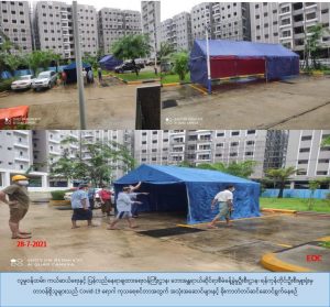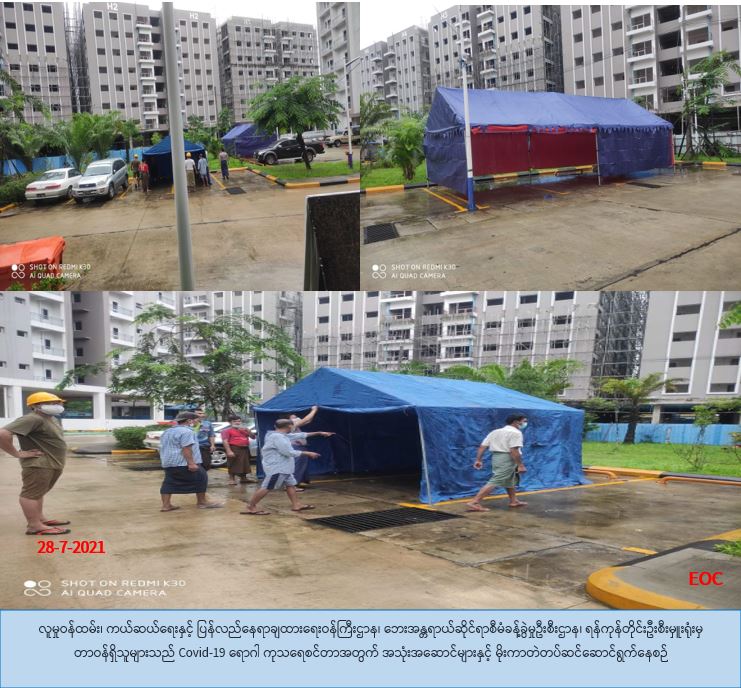 လှုမှုဝန်ထမ်း၊ ကယ်ဆယ်ရေးနှင့် ပြန်လည်နေရာချထားရေးဝန်ကြီးဌာန၊ ဘေးအန္တရာယ်ဆိုင်ရာ စီမံခန့်ခွဲမှုဦးစီးဌာန၊ ရန်ကုန်တိုင်းဦးစီးမှူးရုံးမှ တာဝန်ရှိသူများသည် လှိုင်မြို့နယ် Covid-19 ရောဂါ ကုသရေးစင်တာတွင် လူနာများ၏ ပစ္စည်းနှင့်အစားအသောက်များ လက်ခံရန်နေရာအတွက် မိုးကာတဲ(၂)လုံးအား (၂၆-၇-၂၀၂၁)ရက်နေ့ ညနေပိုင်းတွင် သွားရောက်တပ်ဆင် ပေးခဲ့ပါကြောင်း သတင်းရရှိပါသည်။