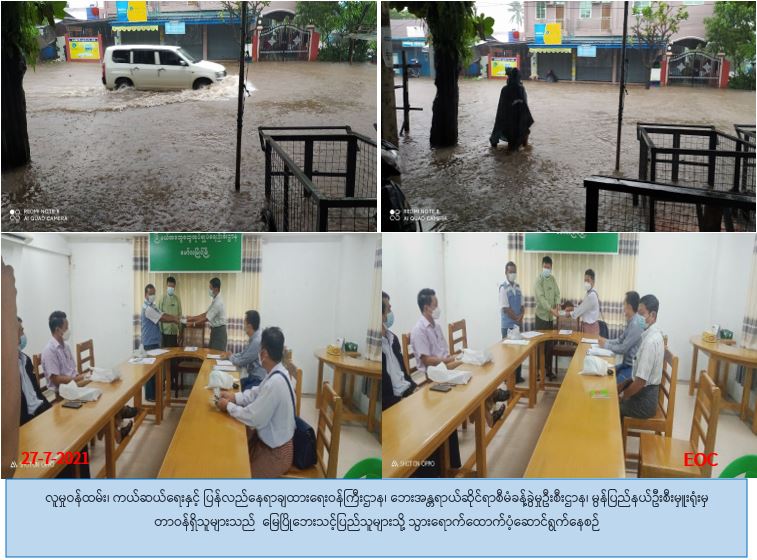 လှုမှုဝန်ထမ်း၊ ကယ်ဆယ်ရေးနှင့် ပြန်လည်နေရာချထားရေးဝန်ကြီးဌာန၊ ဘေးအန္တရာယ်ဆိုင်ရာ စီမံခန့်ခွဲမှုဦးစီးဌာန၊ မွန်ပြည်နယ်ဦးစီးမှူးရုံးမှ တာဝန်ရှိသူများသည် ချောင်းဆုံမြို့နယ်၊ ကွမ်ရိုက်ကျေးရွာအုပ်စု၌ တောင်ပေါ်မြေပြိုကျမှုကြောင့် လုံးဝပျက်စီးဆုံးရှုံးခဲ့သည့် အိမ်ထောင်စု( ၂)စု အတွက် အိမ်ဆောက်ပစ္စည်းဖိုးငွေ (၄၀၀၀၀ဝ)၊ လူဦးရေ (၄)ဦးအတွက် (၇)ရက်စာ ဆန်ဖိုးငွေ (၈၄၀၀)၊ ကယ်ဆယ်ရေးပစ္စည်း (၁၆)မျိုးပါ (၂)ပုံး(ကယ်ဆယ်ရေးပစ္စည်းတန်ဖိုးငွေ (၉၂၀၇၂)နှင့် သေဆုံးသူ (၁)ဦးအတွက်ထောက်ပံ့ငွေ (၃၀၀၀၀၀) တို့အား (၂၇.၇.၂၀၂၁)ရက်နေ့. (၁၀:၀၀)အချိန်ခန့်တွင် မွန်ပြည်နယ်စီမံအုပ်ချုပ်ရေးကောင်စီအဖွဲ့ဝင် ဦးအောင်ကြည်သိန်း၊ ချောင်းဆုံမြိုနယ် စီမံအုပ်ချုပ်ရေးအဖွဲ့ ဥက္ကဌနှင့်အဖွဲ့ဝင်များနှင့်အတူ ဘေးသင့်ပြည်သူများ လက်ဝယ်အရောက် သွားရောက်ထောက်ပံ့ခဲ့ပါသည်။ ၎င်းနောက် ကျန်ရှိသောလေဘေးသင့် အိမ်ထောင်စုများနှင့် မြေပြိုဘေးသင့်အိမ်ထောင်စုများအား ဆက်လက်ထောက်ပံ့သွားမည် ဖြစ်ပေါကြောင်း သတင်းရရှိပါသည်။