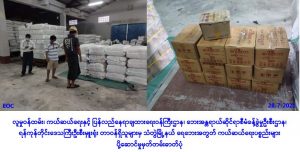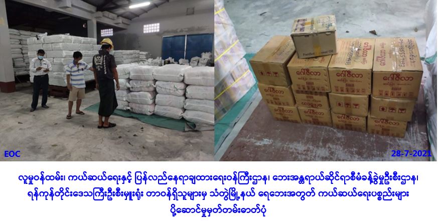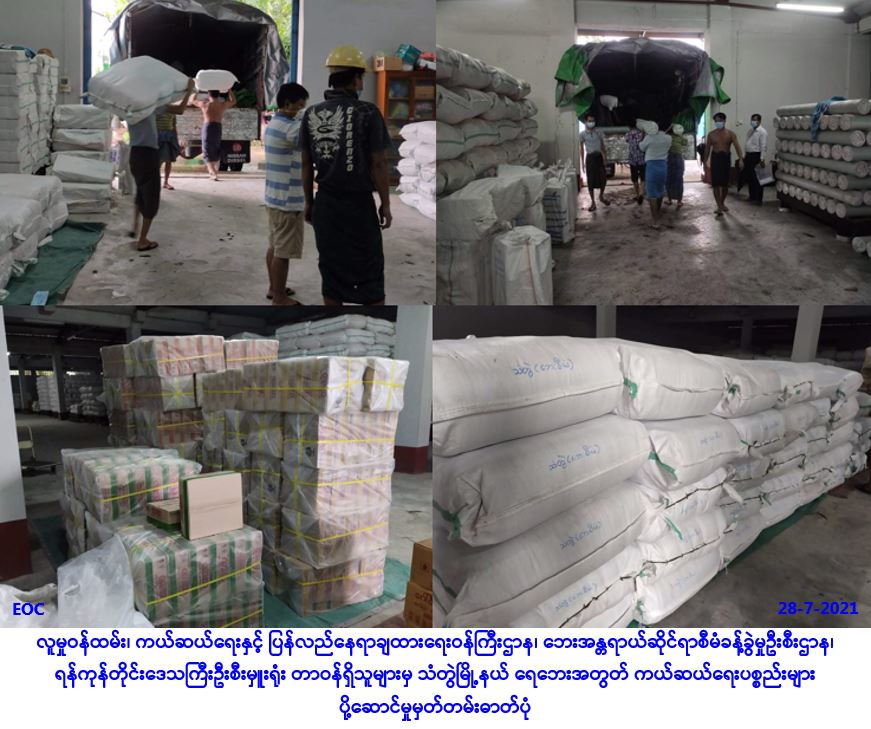 ဝန်ထမ်း၊ ကယ်ဆယ်ရေးနှင့် ပြန်လည်နေရာချထားရေးဝန်ကြီးဌာန၊ ဘေးအန္တရာယ် ဆိုင်ရာစီမံခန့်ခွဲမှုဦးစီးဌာန၊ ရန်ကုန်တိုင်းဒေသကြီးဦးစီးမှူးရုံးမှ တာဝန်ရှိသူများသည် ပြည်ထောင်စုဝန်ကြီး၊ ဒုတိယဝန်ကြီး၊ အမြဲတန်းအတွင်းဝန်၊ တာဝန်ခံညွှန်ကြားရေးမှူး ချုပ်နှင့် ဒုတိယညွှန်ကြားရေးမှူးချုပ်တို့၏ လမ်းညွှန်မှုအရ ရခိုင်ပြည်နယ်၊ သံတွဲမြို့နယ် ရေဘေးအတွတ် ထောက်ပံ့ရန် ဗဟိုသိုလှောင်ရုံ (ရန်ကုန်) မှ စောင် (၅၀၀)ထည်၊ နှစ်ယောက်အိပ်ခြင်ထောင် (၅၀၀)လုံး၊ တာပေါ်လင် (၁၀)လိပ်၊ အဝတ်နှာခေါင်းစည်း (၁၅၀၀၀)ခု၊ ဆပ်ပြာ (၁၀၀၀) တောင့်နှင့် အသင့်စားခေါက်ဆွဲခြောက် (၁)ဖာလျှင် အထုပ်(၃၀)ထုပ်ပါ ဖာ(၅၀၀) တို့ကို ရန်ကုန်မြို့မှ ယာဉ်အမှတ် YGN/2E-7551 (၆) ဘီးယာဉ်ဖြင့် (၂၈-၇-၂၀၂၁)ရက်နေ့ (၁၆:၀၀) နာရီအချိန်တွင် ပို့ဆောင်ခဲ့ပါကြောင်း သတင်းရရှိပါသည်။