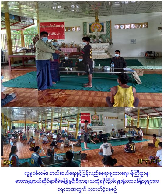လူမှုဝန်ထမ်း၊ ကယ်ဆယ်ရေးနှင့် ပြန်လည်နေရာချထားရေးဝန်ကြီးဌာန၊ ဘေးအန္တရာယ်ဆိုင်ရာစီမံခန့်ခွဲမှုဦးစီးဌာန၊ သထုံခရိုင်ဦးစီးမှူးရုံးမှ တာဝန်ရှိသူများသည် (၂၆-၇-၂၀၂၁)ရက်နေ့၊ ( ၂၇-၇-၂၀၂၁)ရက်နေ့နှင့် (၂၈-၇-၂၀၂၁)ရက်နေ့တို့တွင် မွန်ပြည်နယ် သထုံခရိုင်၊ သထုံမြို့နယ်၊ ဒူးရင်းဆိပ်ကျေးရွာအုပ်စုတွင် ဒုံသမိမြစ်ရေမြင့်တက်လာမှုကြောင့် ရေဘေးရှောင်ကယ်ဆယ်ရေးစခန်း(၂)ခုသို့ရွှေ့ပြောင်းခဲ့ရသည့် အိမ်ခြေ(၂၃)လုံး ၊ အိမ်ထောင်စု (၂၃)စုမှ လူဦးရေ(၁၀၃)ဦးတို့အတွက် (၇)ရက်စာဆန်ရိက္ခာဖိုးထောက်ပံ့ငွေ (၂၁၆,၃၀ဝ/-)ကျပ်အားလည်းကောင်း၊ သထုံမြို့နယ်၊ အောက်ကျင်းရပ်ကွက်အတွင်း ရေဝင်ရောက်မှုကြောင့် ရေဘေးရှောင်ကယ်ဆယ်ရေးစခန်း( ၂)ခုသို့ ရွှေ့ပြောင်းခဲ့ရသည့် အိမ်ခြေ( ၅)လုံး၊ အိမ်ထောင်စု ( ၅)စုတို့မှ လူဦးရေစုစုပေါင်း(၂၈) ဦးတို့အတွက် (၇)ရက်စာဆန်ရိက္ခာထောက်ပံ့ငွေ(၅၈၈၀၀/-) ကျပ်အားလည်းကောင်း (၂၉-၇-၂၀၂၁)ရက်နေ့(၁၄း၃၀)နာရီအချိန်ခန့်၌ သထုံမြို့နယ် စီမံအုပ်ချုပ်ရေးအဖွဲ့နှင့်အတူ ဒူးရင်းဆိပ်ကျေးရွာ၊ ရွာလယ်ဓမ္မာရုံတွင် သွားရောက်ထောက်ပံ့ ပေးအပ်ခဲ့ပါကြောင်း သတင်းရရှိပါသည်။
