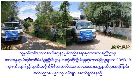 လူမှု၀န်ထမ်း၊ကယ်ဆယ်ရေးနှင့်ပြန်လည်နေရာချထားရေး၀န်ကြီးဌာန၊ ဘေးအန္တရာယ်ဆိုင်ရာ စီမံခန့်ခွဲမှုဦးစီးဌာန၊ မန္တလေးတိုင်းဒေသကြီးဦးစီးမှူးရုံးမှ တာ၀န်ရှိသူများသည် မန္တလေးတိုင်းဒေသကြီး၊ ငါန်းဇွန်မြို့နယ်အတွင်းရှိ ကျေးရွာများသို့ (၂၉-၇-၂၀၂၁) ရက်နေ့တွင် COVID-19 ကူးစက်ရောဂါဆိုင်ရာ အသိပညာပေးခြင်းနှင့် ရာသီအလိုက်ဖြစ်ပွားတတ်သော သဘာဝဘေးအန္တရာယ်များအကြောင်း အသိပညာပေးခြင်း ဆောင်ရွက်ခဲ့ပါကြောင်း သတင်းရရှိပါသည်။