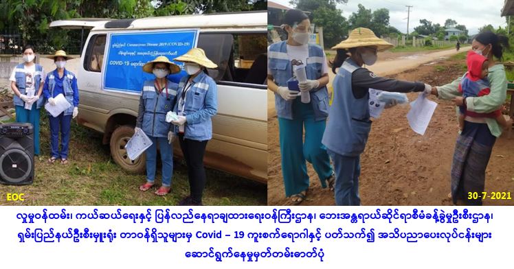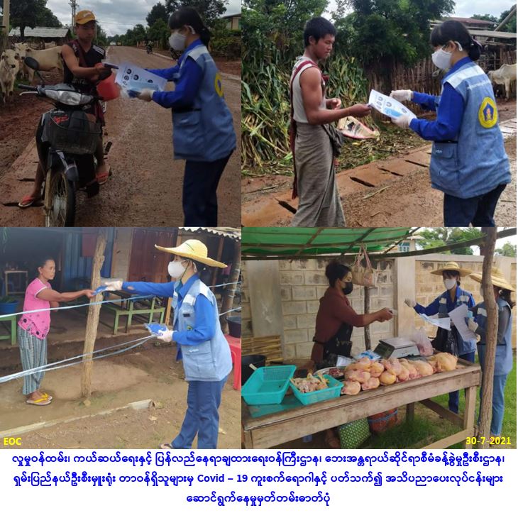 လှုမှုဝန်ထမ်း၊ ကယ်ဆယ်ရေးနှင့် ပြန်လည်နေရာချထားရေးဝန်ကြီးဌာန၊ ဘေးအန္တရာယ်ဆိုင်ရာ စီမံခန့်ခွဲမှုဦးစီးဌာန၊ ရှမ်းပြည်နယ်ဦးစီးမှူးရုံးမှ တာဝန်ရှိသူများသည် (၃၀-၇-၂၀၂၁)ရက်နေ့တွင် တောင်ကြီးမြို့နယ်၊ ကုန်းမုန်ကျေးရွာ၊ ကန်တုန်ကျေးရွာနှင့် သံလွန်းစံပြကျေးရွာတို့တွင် Covid – 19 ရောဂါ တတိယလှိုင်းကူးစက်ပျံ့နှံ့မှုပိုမိုမဖြစ်ပွားစေရန်အတွက် ဆောင်ရန်/ ရှောင်ရန်အချက်များကို အသံချဲ့စက်ဖြင့် နှိုးဆော်ခြင်း၊ အသိပညာပေးလက်ကမ်းစာစောင်နှင့် တစ်ခါသုံး Mask ဝေငှခြင်း အစီအစဉ်တို့ကို ဆောင်ရွက်ခဲ့ပါကြောင်း သတင်းရရှိပါသည်။