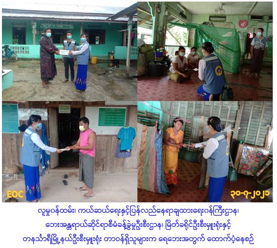 လူမှုဝန်ထမ်း၊ ကယ်ဆယ်ရေးနှင့် ပြန်လည်နေရာချထားရေးဝန်ကြီးဌာန၊ ဘေးအန္တရာယ်ဆိုင်ရာစီမံခန့်ခွဲမှုဦးစီးဌာန၊ မြိတ်ခရိုင်ဦးစီးမှူးရုံးနှင့် တနင်္သာရီမြို့နယ်ဦးစီးမှူးရုံးမှ တာဝန်ရှိသူများသည် (၂၇.၇.၂၀၂၁)ရက်နေ့၌ တနင်္သာရီမြို့နယ်တွင် တနင်္သာရီမြစ်ရေဝင်ရောက်မှုကြောင့် ရိပ်သာကျောင်းယာယီကယ်ဆယ်ရေးစခန်းသို့ပြောင်းရွေ့နေထိုင်လျက်ရှိသည့် အိမ်ထောင်စု (၇)စု၊ လူဦးရေ(၄၆)ဦး၊ ချောင်းကြီးဘုန်းကြီးကျောင်းယာယီကယ်ဆယ်ရေးစခန်းသို့ပြောင်းရွေ့နေထိုင်လျက်ရှိသည့် အိမ်ထောင်စု (၃)စု၊ လူဦးရေ(၁၂)ဦး၊ တပ်ဦး(အမက)ကျောင်းယာယီကယ်ဆယ်ရေးစခန်းသို့ပြောင်းရွေ့နေထိုင်လျက်ရှိသည့် အိမ်ထောင်စု ၁ စု၊ လူဦး ရေ ( ၆)ဦး၊ ပျို့အိုင်ကျေးရွာမူလွန်ကျောင်းယာယီကယ်ဆယ်ရေးရှိ အိမ်ထောင်စု(၄)စု၊ လူဦးရေ (၁၇)ဦး၊ မြေမအုံ့ကျေးရွာရှိ Multipurpose Shelter ယာယီကယ်ဆယ်ရေးစခန်းသို့ပြောင်းရွေ့နေထိုင်လျက်ရှိသည့် အိမ်ထောင်စု(၁)စု၊ လူဦးရေ(၄)ဦး၊ စုစုပေါင်းအိမ်ထောင်စု (၁၆)စု၊ စုစုပေါင်းလူဦးရေ (၈၈)ဦးအတွက် ဆန်ရိက္ခာဖိုးထောက်ပံ့ငွေ (၁၈၄,၈၀၀ိ/-)ကျပ်အား(၃၀.၇.၂၀၂၁)ရက်နေ့(၁၁း၃၀)အချိန်တွင် သွားရောက်ထောက်ပံ့ပေးအပ်ခဲ့ပြီး ဘေးအန္တရာယ်အသိပညာပေး လက်ကမ်းစာစောင်များဝေငှခဲ့ပါကြောင်း သတင်းရရှိပါသည်။