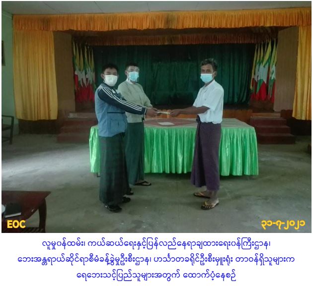 လူမှုဝန်ထမ်း၊ ကယ်ဆယ်ရေးနှင့်ပြန်လည်နေရာချထားရေးဝန်ကြီးဌာန၊ ဘေးအန္တရာယ်ဆိုင်ရာစီမံခန့်ခွဲမှုဦးစီးဌာန၊ ဟင်္သာတခရိုင်ဦးစီးမှူးရုံးမှ တာဝန်ရှိသူများသည် (၂၇-၇-၂၀၂၁)ရက်နေ့၌ လေးမျက်နှာမြို့နယ်အတွင်း ဖြစ်ပွားခဲ့သော တောင်ကျချောင်းရေကြောင့် ရေကြီးနစ်မြုပ်သဖြင့် ကျားကိုက်ဘုန်းကြီးကျောင်းနှင့် စောပြာလမ်းဘေးရှိ ဂိုဒေါင်တို့တွင် ဖွင့်လှစ်ထားသည့် ရေဘေးကယ်ဆယ်ရေးစခန်းရှိ အိမ်ထောင်စု(၁၄)စုမှ လူဦးရေ(၅၁)ဦးတို့အတွက် ဆန်ရိက္ခာဖိုးရန်ပုံငွေ(၁၀၇၁၀၀/-)ကျပ်နှင့် ရေကြီးမှုကြောင့် ချောင်းရိုးတစ်လျှောက် မျောပါသွားသူ (၂)ဦးအတွက် ကယ်ဆယ်ရေးထောက်ပံ့ငွေ(၆၀၀၀၀၀/-)ကျပ်နှင့် ရွှေ့ပြောင်းအိမ်ခြေ(၁)လုံးအတွက် အိမ်ဆောက်ပစ္စည်းရန်ပုံငွေ(၁၀၀၀၀၀/-)ကျပ်၊ လူဦးရေ(၃)ဦးအတွက် ဆန်ရိက္ခာဖိုးရန်ပုံငွေ(၆၃၀၀/-)ကျပ် စုစုပေါင်းထောက်ပံ့ငွေ (၈၁၃၄၀၀/-)ကျပ်တို့အား (၃၁-၇-၂၀၂၁)ရက်နေ့(၁၁း၃၀)အချိန်၌ လေးမျက်နှာမြို့နယ် စီမံအုပ်ချုပ်ရေးအဖွဲ့ရုံးတွင် ထောက်ပံ့ပေးအပ်ခဲ့ပါကြောင်း သတင်းရရှိပါသည်။