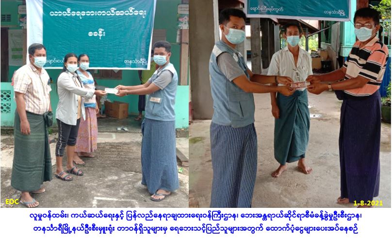 လူမှုဝန်ထမ်း၊ ကယ်ဆယ်ရေးနှင့် ပြန်လည်နေရာချထားရေးဝန်ကြီးဌာန၊ ဘေးအန္တရာယ်ဆိုင်ရာ စီမံခန့်ခွဲမှုဦးစီးဌာန၊ တနင်္သာရီမြို့နယ်ဦးစီးမှူးရုံးမှ တာဝန်ရှိသူများသည် (၂၇-၇-၂၀၂၁) ရက်နေ့ တွင် တနင်္သာရီမြစ်ရေဝင်ရောက်မှုကြောင့် တပ်ဦး အမကကျောင်း ယာယီကယ်ဆယ်ရေးစခန်း သို့ ထပ်မံပြောင်းရွေ့နေထိုင်လျက်ရှိသည့် အိမ်ထောင်စု (၄) စု၊ လူဦးရေ (၁၈)ဦး၊ မြသီတာ ဘုန်းကြီးကျောင်း ယာယီကယ်ဆယ်ရေးစခန်းများသို့ ထပ်မံပြောင်းရွေ့နေထိုင်လျက်ရှိသည့် အိမ်ထောင်စု (၁)စု၊ လူဦးရေ (၆)ဦး၊ ချောင်းကြီးဘုန်းကြီးကျောင်း ယာယီကယ်ဆယ်ရေးစခန်းသို့ ထပ်မံပြောင်းရွှေ့နေထိုင်လျက်ရှိသည့် အိမ်ထောင်စု(၃) စု၊ လူဦးရေ (၁၇)ဦး၊ မြန်မာအင်းတော် အမက ကျောင်းယာယီကယ်ဆယ်ရေးစခန်းသို့ပြောင်းရွေ့ နေထိုင်လျက်ရှိသည့် အိမ်ထောင်စု (၇)စု၊ လူဦးရေ (၄၅)ဦး၊ ကျောက်မီးကျောင်း ယာယီကယ်ဆယ်ရေးစခန်းသို့ ပြောင်းရွေ့နေထိုင် လျက်ရှိသည့် အိမ်ထောင်စု (၁)စု၊ လူဦးရေ (၄)ဦး၊ မြေမအုံကျေးရွာရှိ Multipurpose Shelter ယာယီကယ်ဆယ်ရေးစခန်းသို့ ထပ်မံပြောင်းရွေ့နေထိုင်လျက်ရှိသည့် အိမ်ထောင်စု (၂၀)စု၊ လူဦးရေ (၁၁၄)ဦး၊ ပျို့အိုင်ကျေးရွာ မူလွန်ကျောင်း ယာယီကယ်ဆယ်ရေးစခန်းသို့ ထပ်မံ ပြောင်းရွေ့နေထိုင်လျက်ရှိသည့် အိမ်ထောင်စု(၂)စု၊ လူဦးရေ (၁၉)ဦး၊ စုစုပေါင်းအိမ်ထောင်စု (၃၈)စု၊ စုစုပေါင်းလူဦးရေ (၂၂၃)ဦးအတွက် ဆန်ရိက္ခာ ဖိုးထောက်ပံ့ငွေ (၄၆၈,၃၀၀/-)ကျပ်တို့အား (၁-၈-၂၀၂၁)ရက်နေ့ (၁၄းဝဝ)နာရီအချိန်တွင် သွားရောက်ထောက်ပံ့ပေးအပ်ခဲ့ကြောင်း သတင်း ရရှိပါသည်။