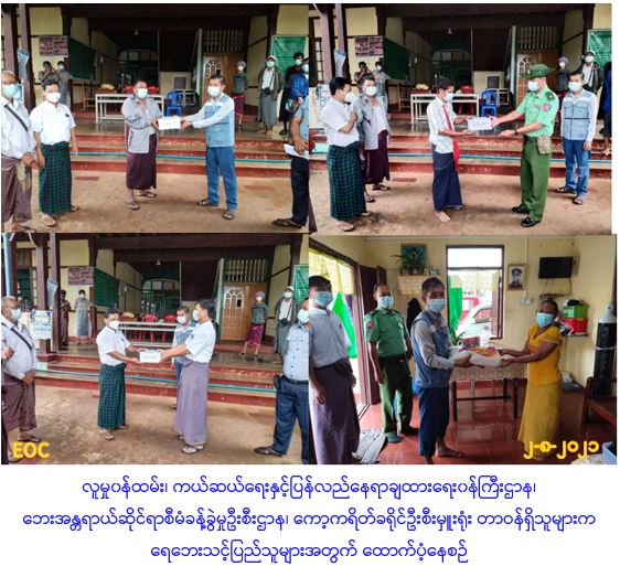 လူမှုဝန်ထမ်း၊ ကယ်ဆယ်ရေးနှင့် ပြန်လည်နေရာချထားရေးဝန်ကြီးဌာန၊ ဘေးအန္တရာယ်ဆိုင်ရာစီမံခန့်ခွဲမှူဦးစီးဌာန၊ ကော့ကရိတ်ခရိုင်ဦးစီးမှူရုံးမှ တာဝန်ရှိသူများသည် ကော့ကရိတ်မြို့နယ်အတွင်းရှိ ရေဘေးကယ်ဆယ်ရေးစခန်းများနှင့် နီးစပ်ရာဆွေးမျိုးနေအိမ်များသို့ ထပ်မံပြောင်းရွှေ့လာသော အိမ်ထောင်စု(၁၈၆)စု၊ လူဦးရေ (၈၂၇)ဦးတို့အတွက် (၁)ပတ်စာ ဆန်ရိက္ခာဖိုးငွေ (၁၇၃၆၇၀၀/-)ကျပ်အား (၂-၈-၂၀၂၁)ရက်နေ့တွင် မြို့နယ်စီမံအုပ်ချုပ်ရေးအဖွဲ့မှ တာဝန်ရှိသူများနှင့်အတူ ဘေးသင့်ပြည်သူများလက်ဝယ်အရောက် ထောက်ပံ့ပြီးဖြစ်ပါကြောင်း သတင်းရရှိပါသည်။
