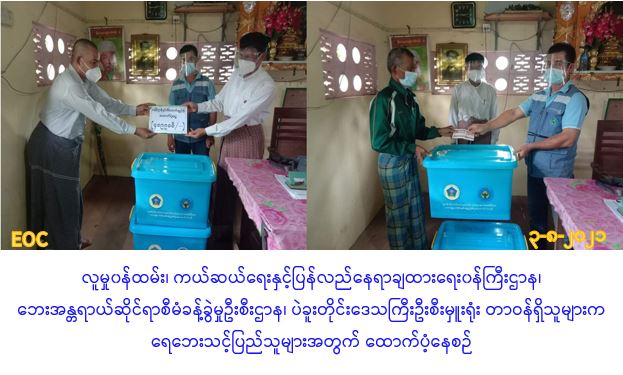 လူမှုဝန်ထမ်း၊ ကယ်ဆယ်ရေးနှင့် ပြန်လည်နေရာချထားရေးဝန်ကြီးဌာန၊ ဘေးအန္တရာယ််ဆိုင်ရာစီမံခန့်ခွဲမှုဦးစီးဌာန၊ ပဲခူးတိုင်းဒေသကြီးဦးစီးမှူးရုံးမှ တာဝန်ရှိသူများသည် (၂-၈-၂၀၂၁)ရက်နေ့၌ ပဲခူးခရိုင်၊ ဒိုက်ဦးမြို့နယ်၊ ဝါဆိုရပ်ကွက်၊ (၂)လမ်း တွင်ဖြစ်ပွားခဲ့သော လေဘေးမှ အမိုးလန်နေအိမ်(၃)လုံး၊ ပြိုလဲနေအိမ်(၂)လုံးတို့အတွက် အိမ်ဆောက်ပစ္စည်းဖိုးထောက်ပံ့ငွေ(၃၇၀၀၀ဝိ/-)၊ လူဦးရေ(၁၉)ဦးအတွက် ဆန်ရိက္ခာဖိုးထောက်ပံ့ငွေ(၃၉၉၀ဝိ/-)၊ စုစုပေါင်းထောက်ပံ့ငွေ(၄၀၉၉၀ဝိ/-)နှင့် ကယ်ဆယ်ရေးပစ္စည်း (၁၇)မျိုး (၁) အိမ်ထောင်စာနှင့် (၁၆)မျိုး(၁)အိမ်ထောင်စာ၊ ကတ္ထူစက္ကူပုံး(၂)ပုံးတို့အား (၃-၈-၂၀၂၁) ရက်နေ့တွင် ဘေးသင့်ပြည်သူများလက်ဝယ်အရောက် သွားရောက်ထောက်ပံ့ပေးအပ်ခဲ့ပါကြောင်း သတင်းရရှိပါသည်။