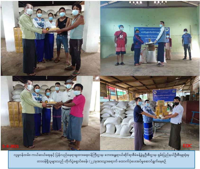 လူမှု၀န်ထမ်း၊ ကယ်ဆယ်ရေးနှင့် ပြန်လည်နေရာချထားရေး၀န်ကြီးဌာန၊ ဘေးအန္တရာယ်ဆိုင်ရာ စီမံခန့်ခွဲမှုဦးစီးဌာန၊ ရှမ်းပြည်နယ်ဦးစီးမှူးရုံး လက်အောက်ရှိခရိုင်/မြို့နယ်မှ တာဝန်ရှိသူများသည် (၃၁.၇.၂၀၂၁) ရက်နေ့မှ (၅.၈.၂၀၂၁)ရက်နေ့အတွင်း ရှမ်းပြည်နယ်အတွင်းရှိ ကွတ်ခိုင်၊ နမ္မတူ၊ နမ့်ခမ်း၊ မန်တုံမြို့နယ်(၄)မြို့နယ်ရှိ တိုက်ပွဲရှောင်စခန်း (၂၂)ခုတို့တွင် အခြေခံစားသောက်ကုန်ပစ္စည်းများ ဖြစ်သည့် ဆန်၊ ဆီ၊ ဆား၊ ကုလားပဲတန်ဖိုး(၃၉၇၇၅၃၀၀ိ/-)တို့အား အိမ်ထောင်စု(၁၄၀၅)စု၊ လူဦးရေ(၇၂၂၉)ဦးတို့အတွက် (၅.၈.၂၀၂၁)ရက်နေ့တွင် သွားရောက် ထောက်ပံ့ပေးခဲ့ပါကြောင်း သတင်းရရှိပါသည်။