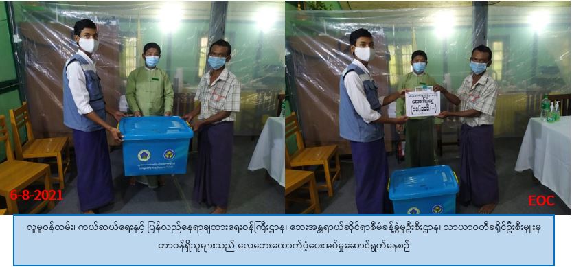 လူမှုဝန်ထမ်း၊ ကယ်ဆယ်ရေလးနှင့် ပြန်လည်ရောချထားရေးဝန်ကြီးဌာန၊ ဘေးအန္တရာယ်ဆိုင်ရာ စီမံခန့်ခွဲမှုဦးစီးဌာန၊ သာယာဝတီခရိုင်ဦးစီးမှူးမှ တာဝန်ရှိသူများသည် ပဲခူးတိုင်းဒေသကြီး၊ သာယာဝတီခရိုင်၊ လက်ပံတန်းမြို့နရယ်ကိုင်းတောစုကျေးရွာအုပ်စု၊ ကိုင်းတောစုကျေးရွာတွင် (၃၁-၇-၂ဝ၂၁)ရက်နေ့ (၂၀း၀၀)အချိန်တွင် ဖြစ်ပွားသော လေဘေးမှပြိုလဲနေအိမ်(၁)လုံးအတွက် အိမ်ဆောက်ပစ္စည်းဖိုး ထောက်ပံ့ငွေ(၁၀၀၀၀ဝိ/-)၊ လူဦးရေ(၃)ဦးတို့အတွက် ဆန်ရိက္ခာဖိုးထောက်ငွေ (၆၃၀ဝိ/-) စုစုပေါင်း(၁၀၆၃၀ဝိ/-)ကျပ်နှင့် ထောက်ပံ့ရေးပစ္စည်း (၁၆)မျိုးပါ (၁)အိမ်ထောင်စုစာ တို့အား(၆-၈-၂၀၂၁)ရက်နေ့ (၁၀း၀၀)အချိန်တွင် ထောက်ပံ့ပြီးဖြစ်ပါကြောင်း သတင်းရရှိပါသည်။