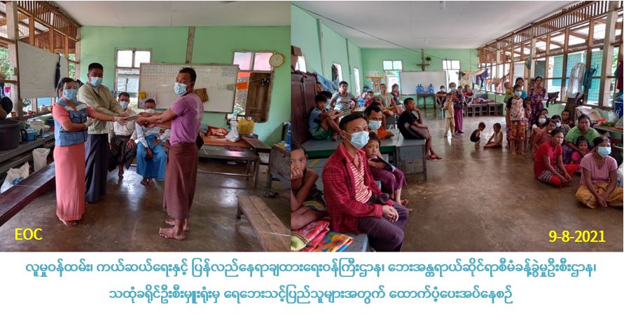 လူမှုဝန်ထမ်း၊ ကယ်ဆယ်ရေးနှင့် ပြန်လည်နေရာချထားရေးဝန်ကြီးဌာန၊ ဘေးအန္တရာယ်ဆိုင်ရာစီမံခန့်ခွဲမှုဦးစီးဌာန၊ သထုံခရိုင်ဦးစီးမှူးရုံးမှ တာဝန်ရှိသူများသည် (၃၀-၇-၂၀၂၁) ရက်နေ့မှ (၇-၈-၂၀၂၁) ရက်နေ့အထိ မွန်ပြည်နယ် သထုံခရိုင်၊ သထုံမြို့နယ်၊ ဒူးရင်းဆိပ် ကျေးရွာအုပ်စုတွင် ဒုံသမိမြစ်ရေမြင့်တက်လာမှုကြောင့် ရေဘေးရှောင်ကယ်ဆယ်ရေးစခန်း(၂)ခုသို့ ရွှေ့ပြောင်းခဲ့ရသည့် ထပ်တိုးအိမ်ထောင်စု (၃၃) စုမှ လူဦးရေ(၁၃၇)ဦးတို့အတွက် (၇) ရက်စာဆန် ရိက္ခာဖိုးထောက်ပံ့ငွေ (၂၈၇,၇၀ဝ) ကျပ်အား (၉-၈-၂၀၂၁) ရက်နေ့ (၁၁:၃၀) နာရီအချိန်ခန့်တွင် သထုံမြို့နယ်စီမံအုပ်ချုပ်ရေးအဖွဲ့တို့နှင့်အတူ ဒူးရင်းဆိပ်ကျေးရွာ အ.ထ.က(ခွဲ) ဒူးရင်းဆိပ်၌ ဘေးသင့်ပြည်သူများထံ လက်ဝယ်အရောက် သွားရောက် ထောက်ပံ့ပေးအပ်ခဲ့ပါကြောင်း သတင်းရရှိပါသည်။