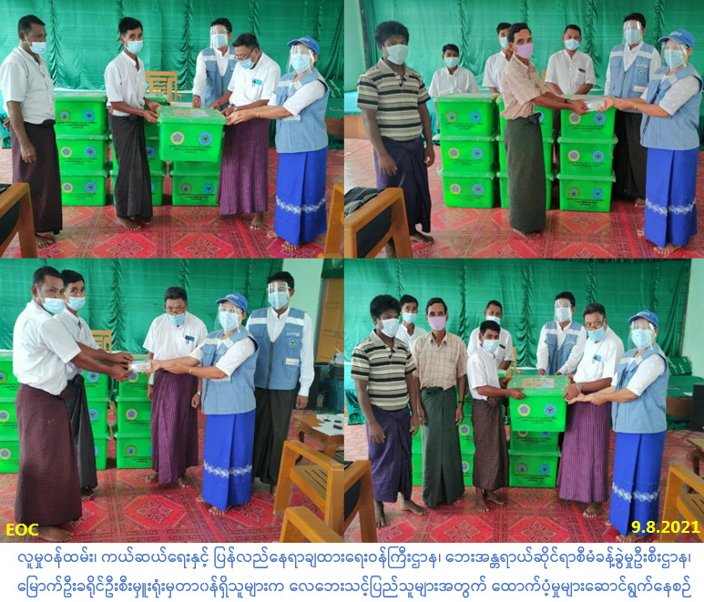 လူမှု၀န်ထမ်း၊ ကယ်ဆယ်ရေးနှင့် ပြန်လည်နေရာချထားရေး၀န်ကြီးဌာန၊ ဘေးအန္တရာယ်ဆိုင်ရာစီမံခန့်ခွဲမှုဦးစီးဌာန၊ မြောက်ဦးခရိုင်ဦးစီးမှူးရုံးမှတာ၀န်ရှိသူများသည် (၃၀-၇-၂၀၂၁) ရက်နေ့ (၀၈:၀၀)နာရီအချိန်တွင် မြောက်ဦးမြို့နယ် ညောင်ပင်လယ်(ကလပ) ကျေးရွာအုပ်စု၊ ညောင်ပင် လယ်(ကလပ)ကျေးရွာတွင် လေဆင်နှာမောင်းတိုက်ခတ်မှုကြောင့် ဘေးသင့် လုံးဝပျက်စီးလူနေ အိမ်(၇)လုံး (သွပ်၊ ဓနိမိုး၊ ပျဥ်၊ ဝါးခင်း၊ ဝါးကာ)အတွက် (၁)လုံးလျှင် (၁၀၀,၀၀၀-/)ကျပ်နှုန်းဖြင့် အိမ်ဆောက်ပစ္စည်းဖိုးထောက်ပံ့ငွေ(၇၀၀,၀၀၀-/)ကျပ်၊ တစ်စိတ်တစ်ပိုင်းပျက်စီးလူနေအိမ် (၁၁) လုံး(သွပ်၊ ဓနိမိုး၊ ပျဥ်၊ ဝါးခင်း၊ ဝါးကာ)အတွက် (၁)လုံးလျှင်(၅၀,၀၀၀-/)ကျပ်နှုန်းဖြင့် အိမ်ဆောက်ပစ္စည်းဖိုးထောက်ပံ့ငွေ (၅၅၀,၀၀၀)ကျပ်၊ ဘေးသင့်အိမ်ထောင်စု(၁၈)စုမှ လူဦးရေ (၇၂)ဦးအတွက် ဆန်ရိက္ခာ(၇)ရက်စာဖိုးထောက်ပံ့ငွေ(၁၅၁,၂၀၀-/)ကျပ်၊ စုစုပေါင်း အိမ်ဆောက် ပစ္စည်းဖိုး ထောက်ပံ့ငွေနှင့် ဆန်ရိက္ခာဖိုး(၁,၄၀၁,၂၀၀-/)ကျပ်၊ လုံးဝပျက်စီးအိမ်ခြေ(၇)လုံး အတွက် ကယ်ဆယ်ရေးပစ္စည်း(၁၇)မျိုး အိမ်ထောင်စု(၇)စုစာအား (၉-၈-၂၀၂၁)ရက်နေ့ (၁၃:၄၀)အချိန်တွင် မြောက်ဦးမြို့နယ်စီမံအုပ်ချုပ်ရေးအဖွဲ့ အစည်းအဝေးခန်းမ၌ မြောက်ဦးမြို့ နယ် စီမံအုပ်ချုပ်ရေးအဖွဲ့မှတာဝန်ရှိသူများ ရပ်ကွက်/ ကျေးရွာအုပ်ချုပ်ရေးမှူးနှင့်အတူ လေ ဘေးသင့်ပြည်သူများထံသို့ ထောက်ပံ့ပေးအပ်ခဲ့ပါကြောင်း သတင်းရရှိပါသည်။