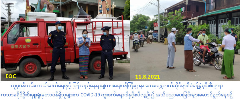လူမှု၀န်ထမ်း၊ ကယ်ဆယ်ရေးနှင့် ပြန်လည်နေရာချထားရေး၀န်ကြီးဌာန၊ ဘေးအန္တရာယ်ဆိုင်ရာစီမံခန့်ခွဲမှုဦးစီးဌာန၊ ကသာခရိုင်ဦးစီးမှူးရုံးမှတာဝန်ရှိသူများသည် (၁၁-၈-၂၀၂၁) ရက်နေ့တွင် (၀၉:၀၀)နာရီအချိန်မှ (၁၁:၀၀)နာရီအချိန်ထိ ကိုဗစ်-၁၉ ကူးစက်ရောဂါကာကွယ်ရေး အသိပညာပေးလုပ်ငန်းကော်မတီအဖွဲ့များ၊ ဌာနဆိုင်ရာအဖွဲ့အစည်းများနှင့်ပူးပေါင်း၍ ကသာမြို့နယ် အတွင်းနေထိုင်သည့် ပြည်သူများသို့ ကိုဗစ်-၁၉ ရောဂါကာကွယ်ရေး လိုက်နာရမည့်စည်းကမ်း ချက်များအား သိရှိလိုက်နာဆောင်ရွက်နိုင်ရေးအတွက် အသံချဲ့စက်ဖြင့် လှည့်လည်အသိပေးနှိုးဆော်ခြင်း၊ နှာခေါင်းစည်း Mask များအခမဲ့ဖြန့်ဝေခြင်း (Mask Camping)နှင့် သဘာဝဘေး အန္တရာယ်အသိပညာပေးစာစောင်များ(မုန်တိုင်းဘေး၊ မိုးကြိုးဘေး၊ လျှပ်စီးဘေး) ဖြန့်ဝေခြင်း တို့အား ဆောက်ရွက်ခဲ့ပါကြောင်း သတင်းရရှိပါသည်။