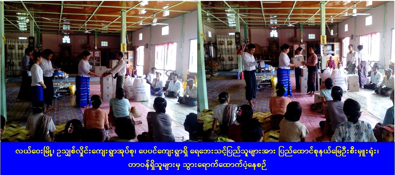 လယ်ဝေးမြို့၊ ဥသျှစ်လှိုင်းကျေးရွာအုပ်စု၊ ပေပင်ကျေးရွာတွင် (၂၆.၉.၂၀၁၆)ရက်နေ့ ဖြစ်ပွားခဲ့သော ရေဘေးတွင် ရေဘေးသင့် အိမ်ထောင်စု(၇၉)စု၊ လူဦးရေ (၃၆၁)ဦးအတွက် ကယ်ဆယ်ရေးပစ္စည်း (၄)မျိုး၊ ရေသန့်ဆေးများအား (၂၇.၉.၂၀၁၆)ရက်နေ့တွင် ပြည်ထောင်စုနယ်မြေဦးစီးမှူးရုံး၊ တာဝန်ရှိသူများမှ သွားရောက်ထောက်ပံ့ပေးအပ်ခဲ့ကြောင်း သတင်းရရှိပါသည်။