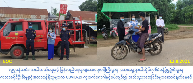 လူမှု၀န်ထမ်း၊ ကယ်ဆယ်ရေးနှင့် ပြန်လည်နေရာချထားရေး၀န်ကြီးဌာန၊ ဘေးအန္တရာယ်ဆိုင်ရာစီမံခန့်ခွဲမှုဦးစီးဌာန၊ ကသာခရိုင်ဦးစီးမှူးရုံးမှတာဝန်ရှိသူများသည် (၁၃-၈-၂၀၂၁) ရက်နေ့တွင် (၀၉:၀၀)နာရီအချိန်မှ (၁၁:၀၀)နာရီအချိန်ထိ ကိုဗစ်-၁၉ ရောဂါကာကွယ်ရေး အသိပညာပေးလုပ်ငန်းကော်မတီ အဖွဲ့များ၊ ဌာနဆိုင်ရာအဖွဲ့အစည်းများနှင့်ပူးပေါင်း၍ ကသာမြို့နယ်အတွင်းနေထိုင်သည့် ပြည်သူများသို့ ကိုဗစ်-၁၉ ရောဂါကာကွယ်ရေးလိုက်နာရမည့် စည်းကမ်းချက်များအား သိရှိလိုက်နာဆောင်ရွက်နိုင်ရန် အသံချဲ့စက်ဖြင့် လှည့်လည်အသိပေးနှိုးဆော်ခြင်း၊ နှာခေါင်းစည်း Mask များအခမဲ့ဖြန့်ဝေခြင်း (Mask Camping)နှင့် သဘာဝဘေးအန္တရာယ် အသိပညာပေးစာစောင်များ(မုန်တိုင်းဘေး၊ မိုးကြိုးဘေး၊ လျှပ်စီးဘေး)ဖြန့်ဝေခြင်းတို့ကို ဆောက်ရွက်ခဲ့ပါကြောင်းသတင်းရရှိပါသည်။