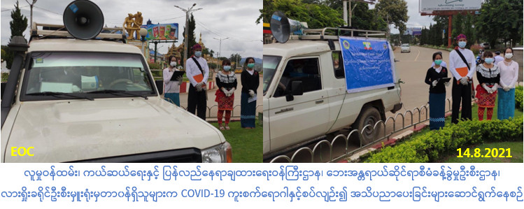 လူမှုဝန်ထမ်း၊ ကယ်ဆယ်ရေးနှင့်ပြန်လည်နေရာချထားရေးဝန်ကြီးဌာန၊ ဘေးအန္တရာယ်ဆိုင်ရာစီမံခန့်ခွဲမှုဦးစီးဌာန၊ လားရှိုးခရိုင်ဦးစီးမှူးရုံးမှတာဝန်ရှိသူများသည် (၁၄-၈-၂၀၂၁) ရက်နေ့တွင် ပြန်ကြားရေးဦးစီးဌာနနှင့်ပူးပေါင်း၍ လားရှိုးမြို့နေပြည်သူများ COVID-19 ရောဂါကြိုတင်ကာကွယ်နိုင်ရေးအတွက် အများပြည်သူသွားလာအသုံးပြုသောလမ်းများ၊ ရပ်ကွက်များသို့လှည့်လည်ကာ ကျန်းမာရေးနှင့်အားကစားဝန်ကြီးဌာနမှ Stay at Home မြို့များအတွက်ထုတ်ပြန်ထားသော အသိပညာပေးချက်များကို မြန်မာဘာသာဖြင့်လည်းကောင်း၊ ကချင်ဘာသာဖြင့်လည်းကောင်း ဖတ်ကြား၍ အသိပညာပေးနှိုးဆော်ခဲ့ပါကြောင်း သတင်းရရှိပါသည်။