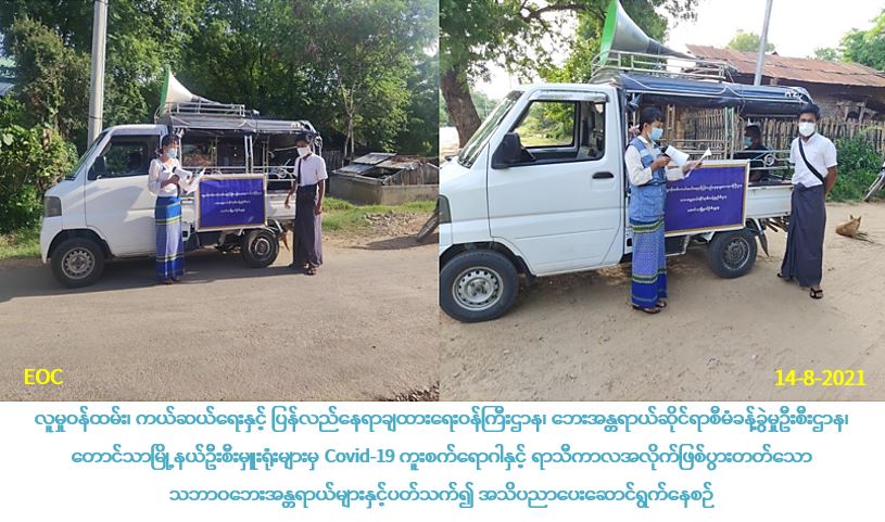 လူမှုဝန်ထမ်း၊ ကယ်ဆယ်ရေးနှင့် ပြန်လည်နေရာချထားရေး၀န်ကြီးဌာန၊ ဘေးအန္တရာယ်ဆိုင်ရာ စီမံခန့်ခွဲမှုဦးစီးဌာန၊ မန္တလေးတိုင်းဒေသကြီးအတွင်းရှိ တောင်သာမြို့နယ်ဦးစီးမှူးရုံးမှ တာဝန်ရှိသူများသည် (၁၄-၈-၂၀၂၁) ရက်နေ့တွင် တောင်သာမြို့နယ်ရှိ အမှတ်(၁)ဘုရာကြီးအနောက်၊ အမှတ်(၃)တန်းမြင့်ကျောင်း၊ အမှတ်(၄) ဈေးရပ်ကွက်၊ အမှတ်(၅)ဘူတာကုန်း၊ အမှတ်(၆)မင်းစု၊ အိုးဘိုကျေးရွာအုပ်စုတွင် အိုးဘို၊ မြေဖြူကုန်း၊ ထန်းတော၊ သပြေပင်၊ ချောင်းနား၊ တမန်ကြီး၊ နန်းမြင့်ကျေးရွာအုပ်စုတွင် နန်းမြင့်၊ ကံဆင့်ကျေးရွာအုပ်စုတွင် ကံဆင့်၊ ဘုရားလှကျေးရွာအုပ်စုတွင် ဘုရားလှ၊ ဆယ်ကုန်းကျေးရွာအုပ်စုတွင် ဆယ်ကုန်း၊ ပေါင်း ရပ်ကွက်(၅)ရပ်ကွက်၊ ကျေးရွာအုပ်စု(၅)စုနှင့် ကျေးရွာ(၁၀)ရွာသို့ COVID-19 အသိပညာပေးခြင်းနှင့် ရာသီကာအလိုက်ဖြစ်ပွားတတ်သော သဘာဝဘေးအန္တရာယ်များအကြောင်း အသိပညာပေးခြင်း ဆောင်ရွက်ခဲ့ပါကြောင်း သတင်းရရှိပါသည်။