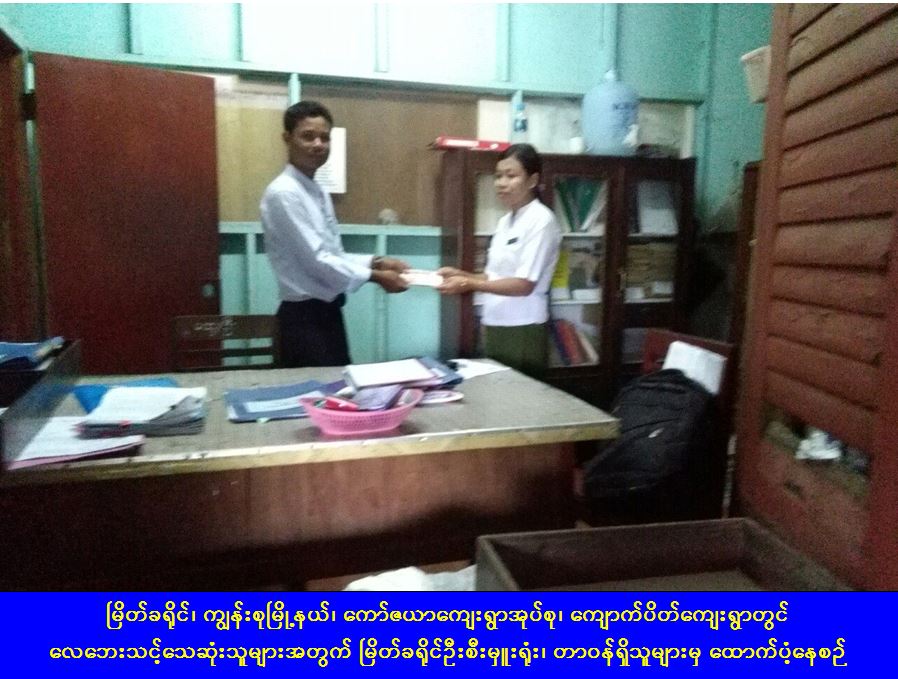 မြိတ်ခရိုင်၊ ကျွန်းစုမြို့နယ်၊ ကော်ဇယာကျေးရွာအုပ်စု၊ ကျောက်ပိတ်ကျေးရွာတွင် (၂၇-၈-၂၀၁၆ ) ရက်နေ့၌ ဖြစ်ပွားခဲ့သည့် လေဘေးကြောင့် သေဆုံးသူ (၂)ဦးအတွက် နာရေးထောက်ပံ့ငွေ တစ်ဦးလျှင် (၁၀၀,၀၀၀/-)ကျပ်တိတိဖြင့် ငွေ (၂၀၀,၀၀၀/-) ကျပ်တိတိအား ကယ်ဆယ်ရေးနှင့် ပြန်လည်နေရာချထားရေးဦးစီးဌာန၊ မြိတ်ခရိုင်ဦးစီးမှူးရုံးမှ (၂၈-၉-၂၀၁၆) ရက်နေ့တွင် ထောက်ပံ့ပေးအပ်ခဲ့ကြောင်း သတင်းရရှိပါသည်။