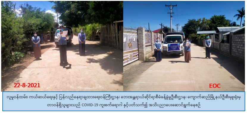 လူမှု၀န်ထမ်း၊ ကယ်ဆယ်ရေးနှင့် ပြန်လည်နေရာချထားရေး၀န်ကြီးဌာန၊ ဘေးအန္တရာယ်ဆိုင်ရာ စီမံခန့်ခွဲမှုဦးစီးဌာန၊ မန္တလေးတိုင်းဒေသကြီးအတွင်းရှိ ကျောက်ဆည်မြို့နယ်ဦးစီးမှူးရုံးမှ တာ၀န်ရှိသူများသည် ကျောက်ဆည်မြို့နယ်ရှိ ခတက်ကုန်းကျေးရွာအုပ်စုတွင် ခတက်ကုန်း၊ ပေါင်းလောင်းကြီးကျေးရွာ အုပ်စုတွင် ပေါင်းလောင်းကြီး၊ ပဲခင်းကျေးရွာအုပ်စုတွင် ပဲခင်း၊ မုန်တိုင်၊ မြေစိုမိုးကောင်းကျေးရွာအုပ်စု တွင် မြေစိုမိုးကောင်း၊ ဘိုးတိုင်ပေါက်၊ မဉ္ဇူခြံ၊ ရွာပု၊ လယ်ကြီး ကျေးရွာအုပ်စုတွင် လယ်ကြီး၊ ဖြိုးသာ၊ ဒါန်း စုစုပေါင်း ကျေးရွာအုပ်စု(၅)စုနှင့် ကျေးရွာ(၁၁)ရွာသို့ (၂၂-၈-၂၀၂၁) ရက်နေ့တွင် COVID-19 အသိပညာပေးခြင်းနှင့် ရာသီကာအလိုက်ဖြစ်ပွားတတ်သော သဘာဝဘေးအန္တရာယ် များအကြောင်း အသိပညာပေးခြင်း ဆောင်ရွက်ခဲ့ပါကြောင်း သတင်းရရှိပါသည်။
