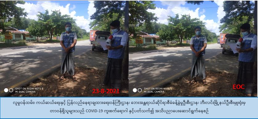 လူမှုဝန်ထမ်း၊ ကယ်ဆယ်ရေးနှင့် ပြန်လည်နေရာချထားရေးဝန်ကြီးဌာန၊ ဘေးအန္တရာယ်ဆိုင်ရာ စီမံခန့်ခွဲမှုဉီးစီးဌာန၊ ဘီးလင်းမြို့နယ်ဦးစီးမှူးရုံးမှ တာဝန်ရှိသူများသည် (၂၃-၈-၂၀၂၀) ရက်နေ့၊ (၁၀:၀၀) နာရီအချိန်မှ (၁၃:၀၀) နာရီအချိန်ထိ မွန်ပြည်နယ်၊ သထုံခရိုင်၊ ဘီးလင်းမြို့နယ်၊ ကျောက်ရေတွင်းကျေးရွာအုပ်စုတွင် Covid-19 ရောဂါကူးစက်ပြန့်ပွားမှုမရှိစေရေးအတွက် သိရှိလိုက်နာ ဆောင်ရွက်သွားမည့်အချက်များ၊ သဘာဝဘေးအန္တရာယ်ဆိုင်ရာအသိပညာပေးနှင့်ပတ်သက်၍ လိုက်နာ ဆောင်ရွက်ရမည့် ဆောင်ရန်/ရှောင်ရန်အချက်များအား ဘီးလင်းမြို့နယ်အတွင်းရှိ ကျောက်ရေတွင်း ကျေးရွာအုပ်စုတွင် နေထိုင်သည့်ပြည်သူများသိရှိစေရန် အသံချဲ့စက်တို့ဖြင့် လှည့်လည်အသိပညာပေး ကြေညာခဲ့ဖြစ်ပါကြောင်း သတင်းရရှိပါသည်။