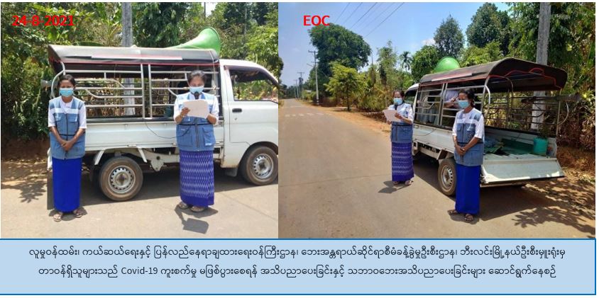 လူမှုဝန်ထမ်း၊ ကယ်ဆယ်ရေးနှင့် ပြန်လည်နေရာချထားရေးဝန်ကြီးဌာန၊ ဘေးအန္တရာယ်ဆိုင်ရာ စီမံခန့်ခွဲမှုဉီးစီးဌာန၊ ဘီးလင်းမြို့နယ်ဦးစီးမှူးရုံးမှ တာဝန်ရှိသူများသည် (၂၄-၈-၂၀၂၀) ရက်နေ့၊ (၀၈:၀၀) နာရီအချိန်မှ (၁၁:၀၀) နာရီအချိန်ထိ မွန်ပြည်နယ်၊ သထုံခရိုင်၊ ဘီးလင်းမြို့နယ်၊ အနှိုင်းပွန်ကျေးရွာအုပ်စုတွင် Covid-19 ရောဂါကူးစက်ပြန့်ပွားမှုမရှိစေရေးအတွက် သိရှိလိုက်နာ ဆောင်ရွက်သွားမည့်အချက်များ၊ သဘာဝဘေးအန္တရာယ်ဆိုင်ရာ အသိပညာပေးနှင့်ပတ်သက်၍ လိုက်နာဆောင်ရွက်ရမည့် ဆောင်ရန်/ရှောင်ရန်အချက်များအား ဘီးလင်းမြို့နယ်အတွင်းရှိ အနှိုင်းပွန်ကျေးရွာအုပ်စုတွင် နေထိုင်သည့်ပြည်သူများသိရှိစေရန် အသံချဲ့စက်တို့ဖြင့် လှည့်လည်အသိပညာပေး ကြေညာခဲ့ဖြစ်ပါကြောင်း သတင်းရရှိပါသည်။