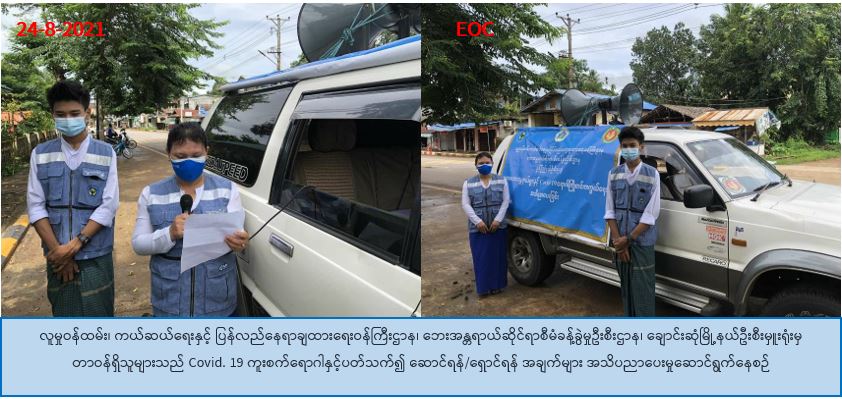 လူမှုဝန်ထမ်း၊ ကယ်ဆယ်ရေးနှင့် ပြန်လည်နေရာချထားရေးဝန်ကြီးဌာန၊ ဘေးအန္တရာယ်ဆိုင်ရာစီမံခန့်ခွဲမှု ဦးစီးဌာန၊ မော်လမြိုင်ခရိုင်၊ ချောင်းဆုံမြို့နယ်ဦးစီးမှူးရုံးမှ တာဝန်ရှိသူများသည် (၂၄-၈-၂၀၂၁) ရက်နေ့ (၀၈:၀၀)အချိန်မှ (၁၁:၃၀)အချိန်ထိ ချောင်းဆုံမြို့နယ်၊ ချောင်းဆုံအရှေ့ရပ်ကွက်နှင့် ကော့မုပွန်ကျေးရွာ အတွင်းရှိ ပြည်သူများအား COVID-19 ရောဂါကူးစက်ပြန့်ပွားမှုများ လျော့နည်းပပျောက်စေရန်အတွက် ဆောင်ရန်/ရှောင်ရန်များကို သိရှိနိုင်စေရန် ကျန်းမာရေးနှင့် အားကစားဝန်ကြီးဌာန၏ လမ်းညွှန်ချက်များကို အသိပညာပေးခြင်းနှင့် ရာသီအလိုက် ဖြစ်ပွားတက်သော သဘာဝဘေးအန္တရာယ်များ နှင့်ပတ်သက်၍ ဆောင်ရန်/ရှောင်ရန် အချက်များကို အသိပညာပေးဆောင်ရွက်ခဲ့ပါကြောင်း သတင်းရရှိပါသည်။