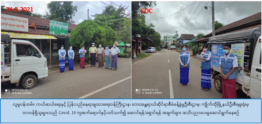 လူမှုဝန်ထမ်း၊ ကယ်ဆယ်ရေးနှင့် ပြန်လည်နေရာချထားရေးဝန်ကြီးဌာန၊ ဘေးအန္တရာယ်ဆိုင်ရာစီမံခန့်ခွဲမှု ဦးစီးဌာန၊ ကျိုက်ထိုမြို့နယ်ဦးစီးမှူးရုံးမှ တာဝန်ရှိသူများသည် (၂၄-၈-၂၀၂၁) ရက်နေ့တွင် (၁၀:၃၀)နာရီ အချိန်မှ (၁၂:၀၀)နာရီအချိန်အထိ မွန်ပြည်နယ် ကျိုက်ထိုမြို့နယ် မြောက်ပိုင်းရပ်ကွက်နှင့် တောင်ပိုင်းရပ်ကွက်တို့တွင် နေထိုင်သောပြည်သူများအား Covid-19 ရောဂါကူးစက်နှံ့မှုများ မဖြစ်ပွားစေရန်အတွက် လိုက်နာဆောင်ရွက်ရမည့် ဆောင်ရန်/ရှောင်ရန်အချက်များကို Hand Speaker တို့ဖြင့် လှည့်လည်အသိပေးဟောပြောခြင်းအား ဆောင်ရွက်ခဲ့ပါကြောင်း သတင်းရရှိပါသည်။