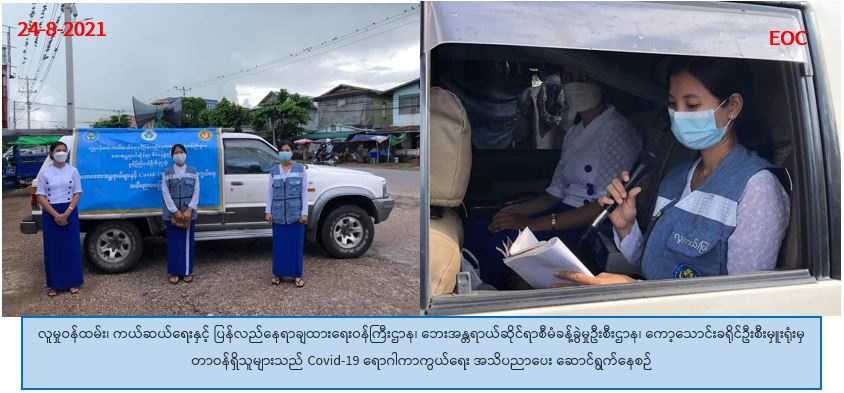 လူမှုဝန်ထမ်း၊ ကယ်ဆယ်ရေးနှင့် ပြန်လည်နေရာချထားရေးဝန်ကြီးဌာန၊ ဘေးအန္တရာယ်ဆိုင်ရာစီမံခန့်ခွဲမှု ဦးစီးဌာန၊ မုဒုံမြို့နယ်ဦးစီးမှူးရုံးမှ တာဝန်ရှိသူများသည် (၂၄-၈-၂၀၂၁) ရက်နေ့၊ (၁၁:၀၀) နာရီအချိန်မှ (၁၄:၀၀) နာရီအချိန်အထိ မွန်ပြည်နယ်၊ မော်လမြိုင်ခရိုင်၊ မုဒုံမြို့နယ်၊ ကျုံဖိုက်ကျေးရွာနှင့် ကော့ခလွယ်ကျေးရွာတို့တွင် သဘာဝဘေးအန္တရာယ်များနှင့် COVID-19 ကူးစက်ရောဂါ ကာကွယ်ရေး အသိပညာပေးခြင်းအားအသံချဲ့စက်များဖြင့် ဟောပြောခဲ့ပြီး လက်ကမ်းစာစောင်များ ဖြန့်ဝေခြင်းတို့အား ဆောင်ရွက်ခဲ့ပါကြောင်း သတင်းရရှိပါသည်။