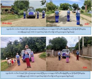 လူမှု၀န်ထမ်း၊ ကယ်ဆယ်ရေးနှင့်ပြန်လည်နေရာချထားရေး၀န်ကြီးဌာန၊ ဘေးအန္တရာယ်ဆိုင်ရာ စီမံခန့်ခွဲမှုဦးစီးဌာန၊ မန္တလေးတိုင်းဒေသကြီးအတွင်းရှိ မြင်းခြံခရိုင်ဦးစီးမှူးရုံးမှ တာဝန်ရှိသူများသည် မြင်းခြံမြို့နယ်တွင် ကိုင်းကျေးရွာအုပ်စု၊ ကိုင်းကျေးရွာ၊ ရန္တပိုကျေးရွာအုပ်စု၊ ရန္တပိုကျေးရွာ၊ ညောင်တိုကျေးရွာအုပ်စု၊ ညောင်တိုကျေးရွာ၊ ဆင်ချောင်းကျေးရွာအုပ်စု၊ ဆင်ချောင်း(တ)ကျေးရွာ၊ ဆင်ချောင်း(မ)ကျေးရွာ၊ တလုပ်မြို့ကျေးရွာအုပ်စု၊ တလုပ်မြို့ကျေးရွာ၊ မြို့ကြီးကုန်းကျေးရွာ၊ မြောက်ရွာလေးကျေးရွာနှင့် ကျောက်ဆည်မြို့နယ်ဦးစီးမှူးရုံးမှ တာ၀န်ရှိသူများသည် ကျောက်ဆည်မြို့နယ်တွင် ရွာသစ်ကျေးရွာအုပ်စု၊ ရွာသစ်ကျေးရွာ၊ ရေသရောက်ကျေးရွာအုပ်စု၊ ရေသရောက်ကျေးရွာ၊ ချောင်းဆုံကျေးရွာအုပ်စု၊ ချောင်းဆုံကျေးရွာ၊ ကြက်သားဟင်းကျေးရွာအုပ်စု၊ ကြက်သားဟင်းကျေးရွာ၊ ပိတောက်ကျေးရွာ၊ ကျည်အင်းကျေးရွာ၊ ပျားကျေးရွာ၊ ရေတွင်းကုန်းကျေးရွာ၊ ရဲရွာကျေးရွာအုပ်စု၊ ရဲရွာကျေးရွာ၊ သရက်ပင်ကျေးရွာအုပ်စု၊ သရက်ပင်ကျေးရွာ၊ သမန်းသာကျေးရွာ ကျေးရွာအုပ်စု(၁၁)စုနှင့် ကျေးရွာ(၁၉)ရွာသို့ (၂၅-၈-၂၀၂၁) ရက်နေ့တွင် COVID-19 အသိပညာပေးခြင်းနှင့် ရာသီကာအလိုက်ဖြစ်ပွားတတ်သော သဘာဝဘေးအန္တရာယ် များအကြောင်း အသိပညာပေးခြင်း ဆောင်ရွက်ခဲ့ပါကြောင်း သတင်းလက်ခံရရှိပါသည်။