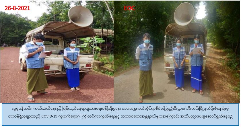 လူမှုဝန်ထမ်း၊ ကယ်ဆယ်ရေးနှင့် ပြန်လည်နေရာချထားရေးဝန်ကြီးဌာန၊ ဘေးအန္တရာယ်ဆိုင်ရာ စီမံခန့်ခွဲမှုဉီးစီးဌာန၊ ဘီးလင်းမြို့နယ်ဦးစီးမှူးရုံးမှ တာဝန်ရှိသူများသည် (၂၆-၈-၂၀၂၀) ရက်နေ့၊ (၀၈:၀၀) နာရီအချိန်မှ (၁၁:၀၀) နာရီအချိန်ထိ မွန်ပြည်နယ်၊ သထုံခရိုင်၊ ဘီးလင်းမြို့နယ်၊ ရွှေလှေကျေးရွာ အုပ်စုတွင် Covid-19 ရောဂါကူးစက်ပြန့်ပွားမှုမရှိစေရေးအတွက် သိရှိလိုက်နာဆောင်ရွက်သွားမည့် အချက်များ၊ သဘာဝဘေးအန္တရာယ်ဆိုင်ရာအသိပညာပေးနှင့်ပတ်သက်၍ လိုက်နာဆောင်ရွက်ရမည့် ဆောင်ရန်/ရှောင်ရန်အချက်များအား ဘီးလင်းမြို့နယ်အတွင်းရှိ ရွှေလှေကျေးရွာအုပ်စုတွင်နေထိုင်သည့် ပြည်သူများသိရှိစေရန် အသံချဲ့စက်တို့ဖြင့် လှည့်လည်အသိပညာပေး ကြေညာခဲ့ဖြစ်ပါကြောင်း သတင်းလက်ခံရရှိပါသည်။