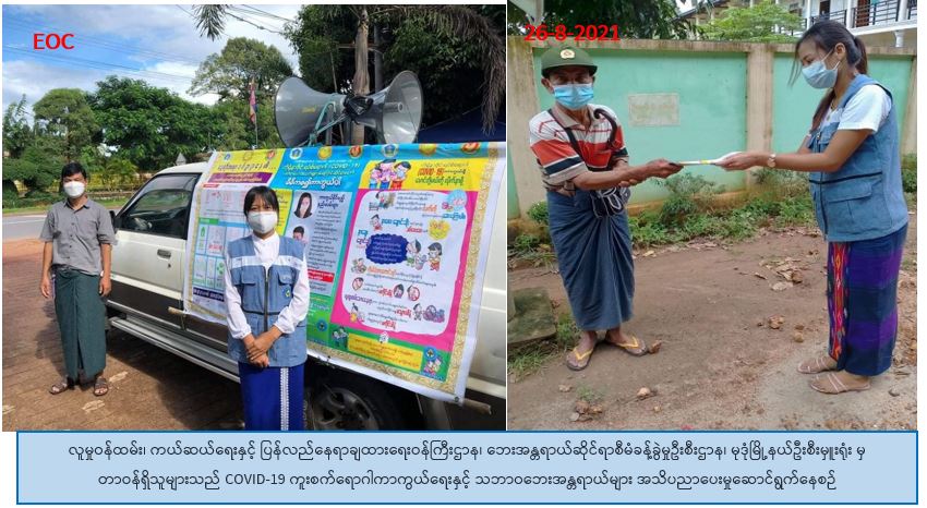လူမှုဝန်ထမ်း၊ ကယ်ဆယ်ရေးနှင့် ပြန်လည်နေရာချထားရေးဝန်ကြီးဌာန၊ ဘေးအန္တရာယ်ဆိုင်ရာစီမံခန့်ခွဲမှု ဦးစီးဌာန၊ မုဒုံမြို့နယ်ဦးစီးမှူးရုံးမှ တာဝန်ရှိသူများသည် (၂၆-၈-၂၀၂၁) ရက်နေ့၊ (၁၁:၀၀) နာရီအချိန်မှ (၁၄:၀၀) နာရီအချိန်အထိ မွန်ပြည်နယ်၊ မော်လမြိုင်ခရိုင်၊ မုဒုံမြို့နယ်၊ ပိုင်ကမာကျေးရွာနှင့် ကျိုက်ရွဲကျေးရွာတို့တွင် သဘာဝဘေးအန္တရာယ်များနှင့် COVID-19ကူးစက်် ရောဂါကာကွယ်ရေး အသိပညာပေးခြင်းအား အသံချဲ့စက်များဖြင့် ဟောပြောခဲ့ပြီး လက်ကမ်းစာစောင်များ ဖြန့်ဝေခြင်းတို့အား ဆောင်ရွက်ခဲ့ပါကြောင်း သတင်းရရှိပါသည်။